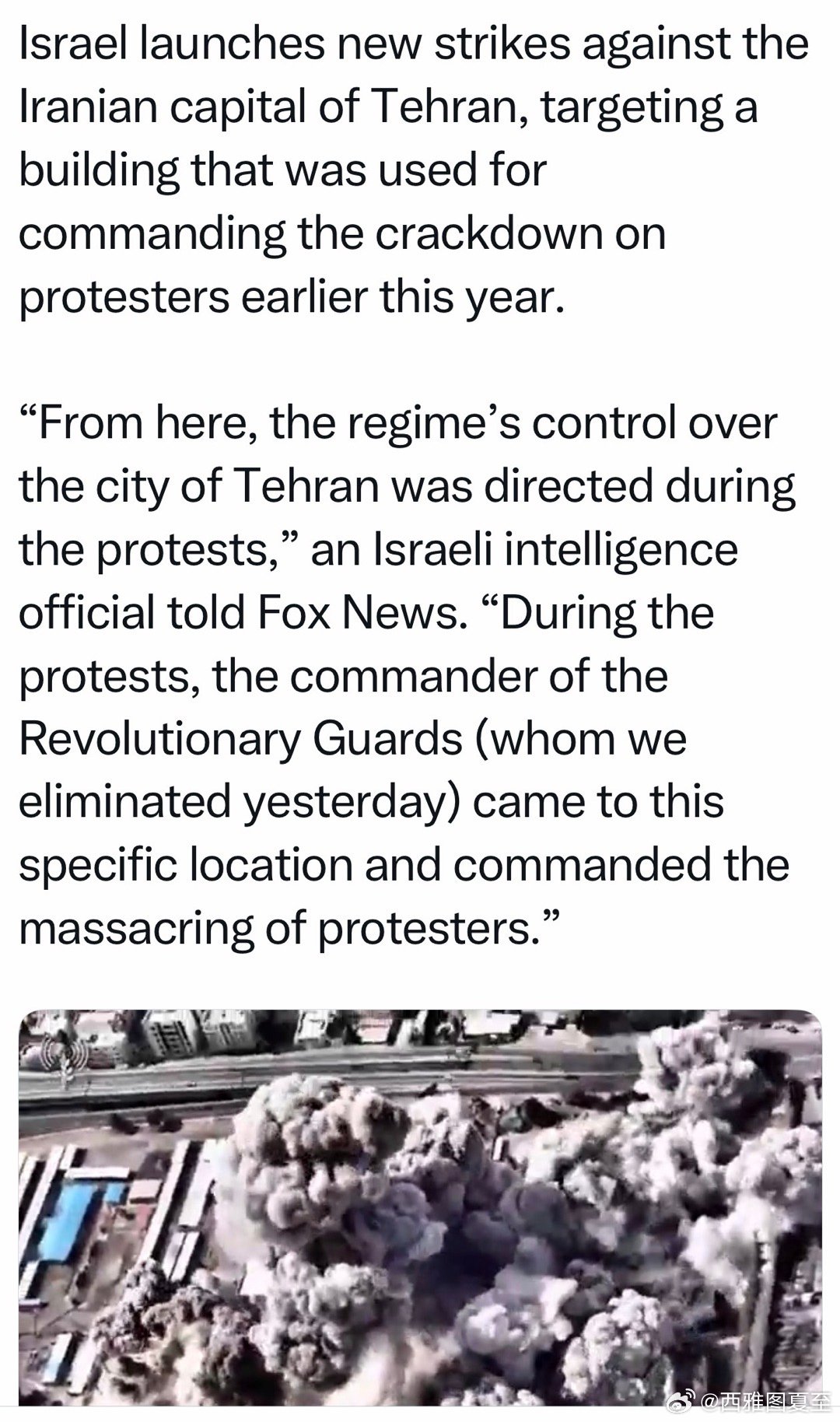 以色列情报官员向美国媒体确认:革命卫队司令已被炸死、革命卫队总部已被摧毁