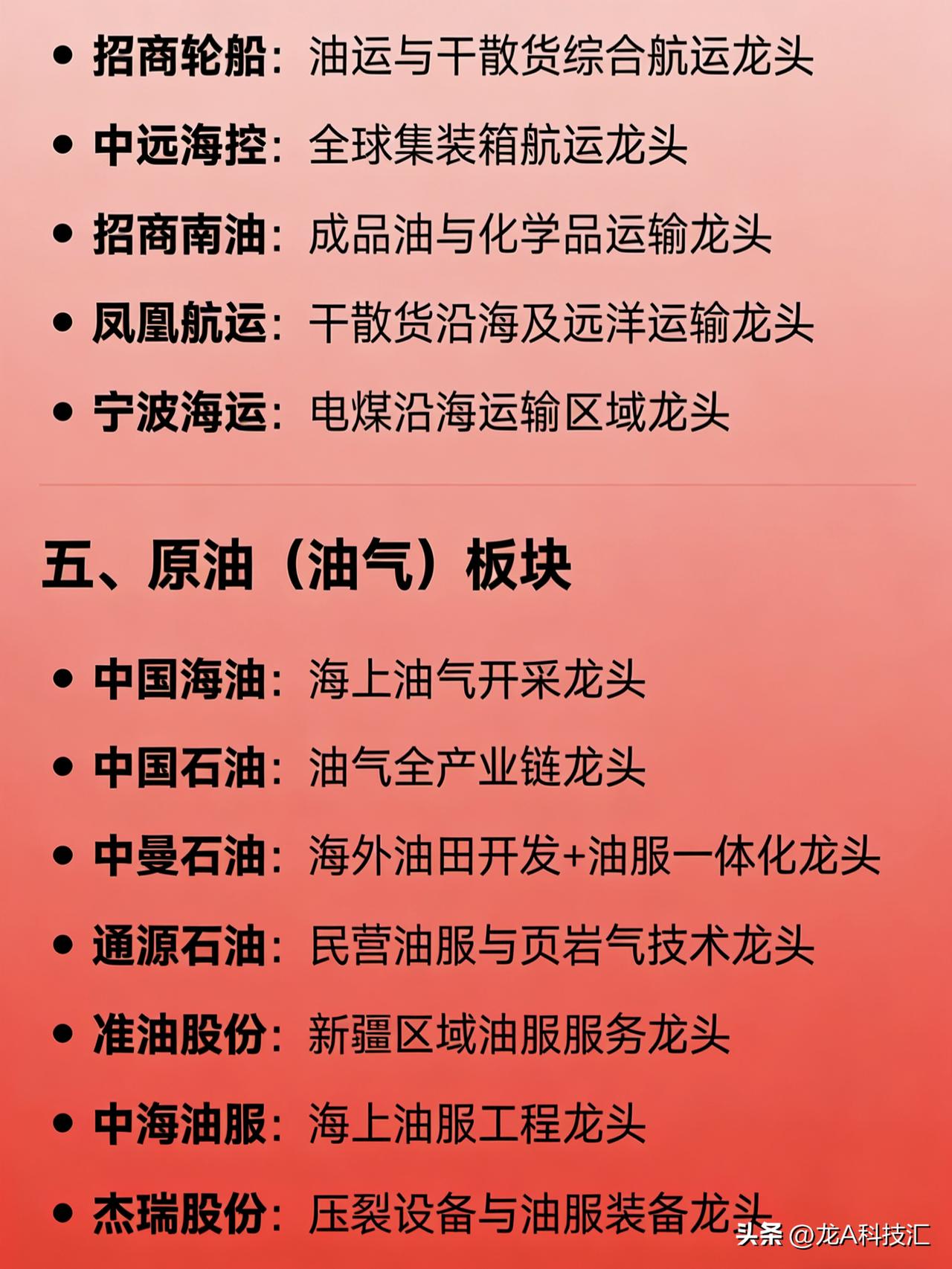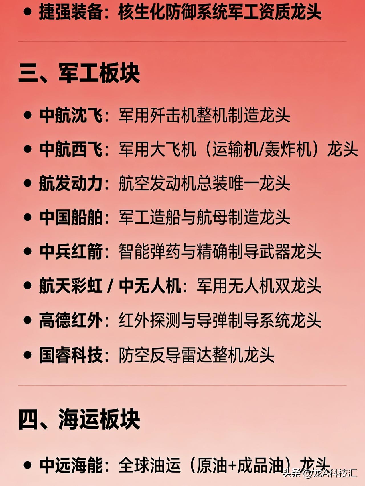 黄金、核污染、军工、海运、原油五大板块细分领域龙头企业汇总 一、黄金板块 紫金矿业:全球矿产金产能龙头 山东黄金:国内自产黄金龙头 中金黄金:央企黄金冶炼与矿山双龙头 赤峰黄金:高弹性黄金矿业龙头 湖南黄金:黄金+锑资源一体化龙头 二、核污染防治板块 中广核技:核技术应用与核环保龙头 中国广核:核电运营与核安全体系龙头 兰石重装:核化工及核安全级装备制造龙头 中金辐照:工业与医疗辐照技术服务龙头 捷强装备:核生化防御系统军工资质龙头 三、军工板块 中航沈飞:军用歼击机整机制造龙头 中航西飞:军用大飞机(运输机/轰炸机)龙头 航发动力:航空发动机总装唯一龙头 中国船舶:军工造船与航母制造龙头 中兵红箭:智能弹药与精确制导武器龙头 航天彩虹 / 中无人机:军用无人机双龙头 高德红外:红外探测与导弹制导系统龙头 国睿科技:防空反导雷达整机龙头 四、海运板块 中远海能:全球油运(原油+成品油)龙头 招商轮船:油运与干散货综合航运龙头 中远海控:全球集装箱航运龙头 招商南油:成品油与化学品运输龙头 凤凰航运:干散货沿海及远洋运输龙头 宁波海运:电煤沿海运输区域龙头 五、原油(油气)板块 中国海油:海上油气开采龙头 中国石油:油气全产业链龙头 中曼石油:海外油田开发+油服一体化龙头 通源石油:民营油服与页岩气技术龙头 准油股份:新疆区域油服服务龙头 中海油服:海上油服工程龙头 杰瑞股份:压裂设备与油服装备龙头