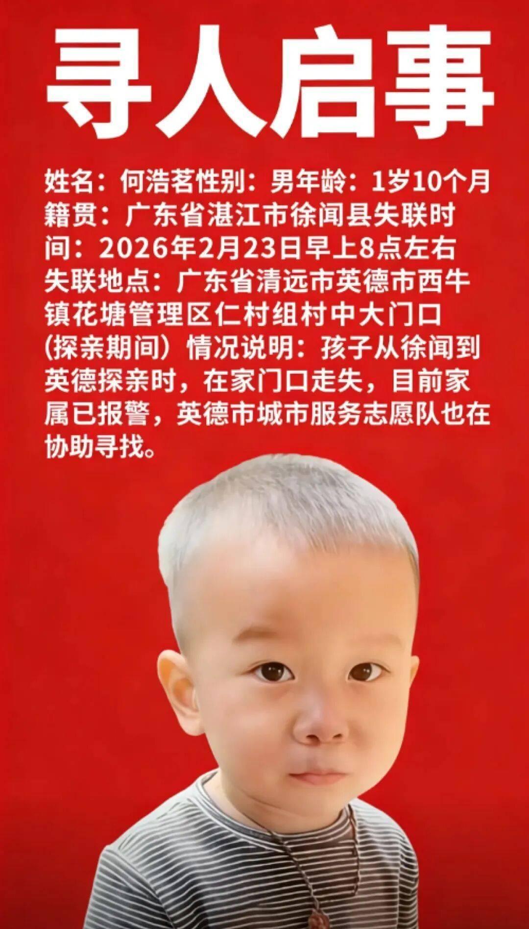 广东 1 岁男童春节探亲时走失离世,几个大人都以为对方在照看小孩 ,家长该如何避免此类看护漏洞? 1岁男童何某某在广东清远仁村组村探亲时走失。母亲表示,当时多名大人在场,彼此误以为对方在照看孩子。25日,救援人员在报警人住所附近鱼塘发现何某某遗体。 近日,一则寻人启事显示,广东一名1岁多男童在英德市西牛镇走失。24日,西牛镇派出所及西牛镇政府的工作人员均证实该消息属实。 据寻人启事,失联男童姓名何浩茗,1岁10个月,广东省湛江市徐闻县人。 2月23日早上8点左右,在西牛镇花塘村仁村组走失,目前家属已报警,英德市城市服务志愿队也在协助寻找。 失联男童母亲表示,当日带着孩子去探亲, 因现场多名大人在,彼此都误以为对方在照看孩子,有十几二十分钟未留心,之后发现孩子走失,已第一时间报警。 她表示,男孩约90厘米高、20多斤重, 走失时身着紫色卫衣外套,内搭蓝色条纹衣服,下身穿牛仔裤,穿着黑色侧边带有两条黄色杠的鞋子。 孩子脖子上佩戴着红绳,系着桃子造型挂饰,挂饰上有玉珠,孩子有咬下嘴唇的习惯。 “事发区域无监控覆盖。”她说。 英德市城市服务志愿队队长表示, 警方及当地村民正围绕事发地周边开展搜寻工作,尚无有效进展。 西牛镇派出所的工作人员称,男童走失事件属实,目前仍在寻人。 参与搜救的英德市城市服务志愿队相关负责人告诉记者,他们于23日接到求助信息后即展开搜寻,目前工作仍在持续。 救援人员在山下发现了孩子的鞋子,但暂未找到其踪迹。 英德市西牛镇人民政府的工作人员向记者证实了男童走失消息属实,并表示搜寻仍在进行中,暂无最新消息。英德市西牛镇花塘村委会负责人则以不便透露为由未作回应。 ------------------------------------ 在农村,一个被期待负责全权照顾孩子的人,往往恰好也是被要求参与家务劳作的人。时刻盯着孩子通常被视为偷懒什么都不做而不被接受。