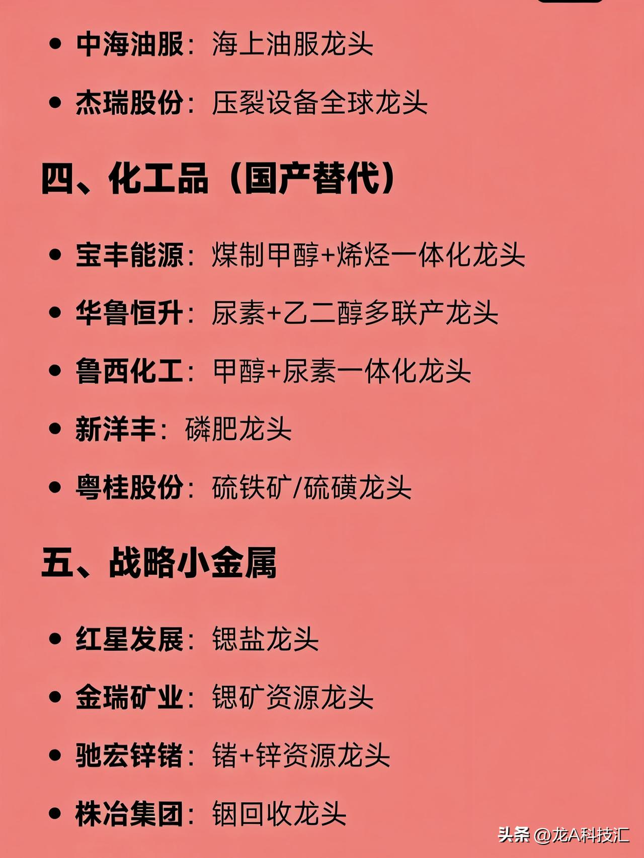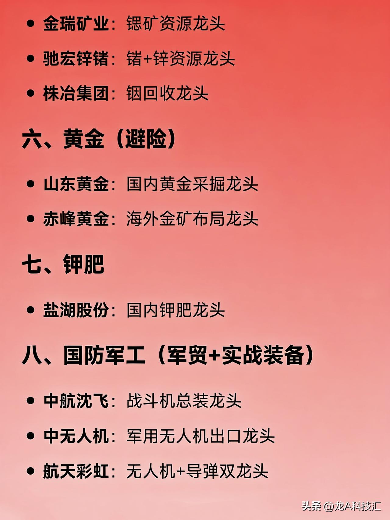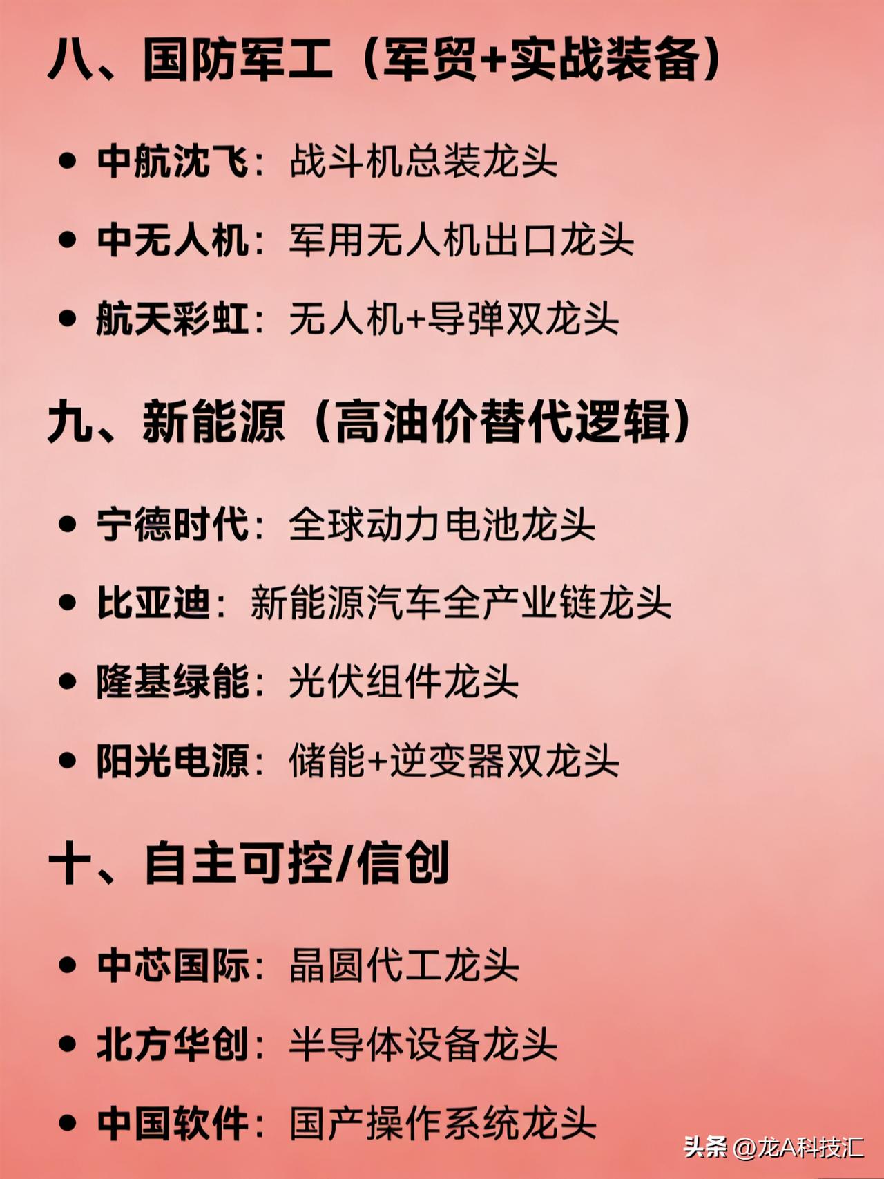 与“伊朗概念”相关的龙头企业汇总 一、油气开采 中国海油:海上油气开采龙头 中国石油:国内油气产量龙头 中曼石油:民营油气+中东项目龙头 二、油轮运输 中远海能:国内油轮运力龙头 招商轮船:VLCC全球运力龙头 三、油服设备 中海油服:海上油服龙头 杰瑞股份:压裂设备全球龙头 四、化工品(国产替代) 宝丰能源:煤制甲醇+烯烃一体化龙头 华鲁恒升:尿素+乙二醇多联产龙头 鲁西化工:甲醇+尿素一体化龙头 新洋丰:磷肥龙头 粤桂股份:硫铁矿/硫磺龙头 五、战略小金属 红星发展:锶盐龙头 金瑞矿业:锶矿资源龙头 驰宏锌锗:锗+锌资源龙头 株冶集团:铟回收龙头 六、黄金(避险) 山东黄金:国内黄金采掘龙头 赤峰黄金:海外金矿布局龙头 七、钾肥 盐湖股份:国内钾肥龙头 八、国防军工(军贸+实战装备) 中航沈飞:战斗机总装龙头 中无人机:军用无人机出口龙头 航天彩虹:无人机+导弹双龙头 九、新能源(高油价替代逻辑) 宁德时代:全球动力电池龙头 比亚迪:新能源汽车全产业链龙头 隆基绿能:光伏组件龙头 阳光电源:储能+逆变器双龙头 十、自主可控/信创 中芯国际:晶圆代工龙头 北方华创:半导体设备龙头 中国软件:国产操作系统龙头