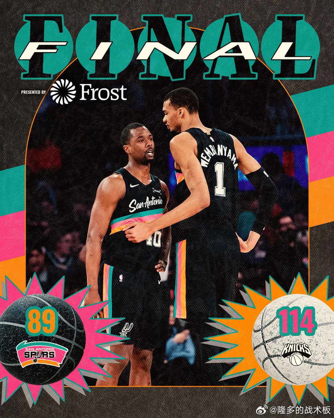 马刺11连胜被终结,客场89-114不敌尼克斯马刺全场出现22次失误,文班亚马7