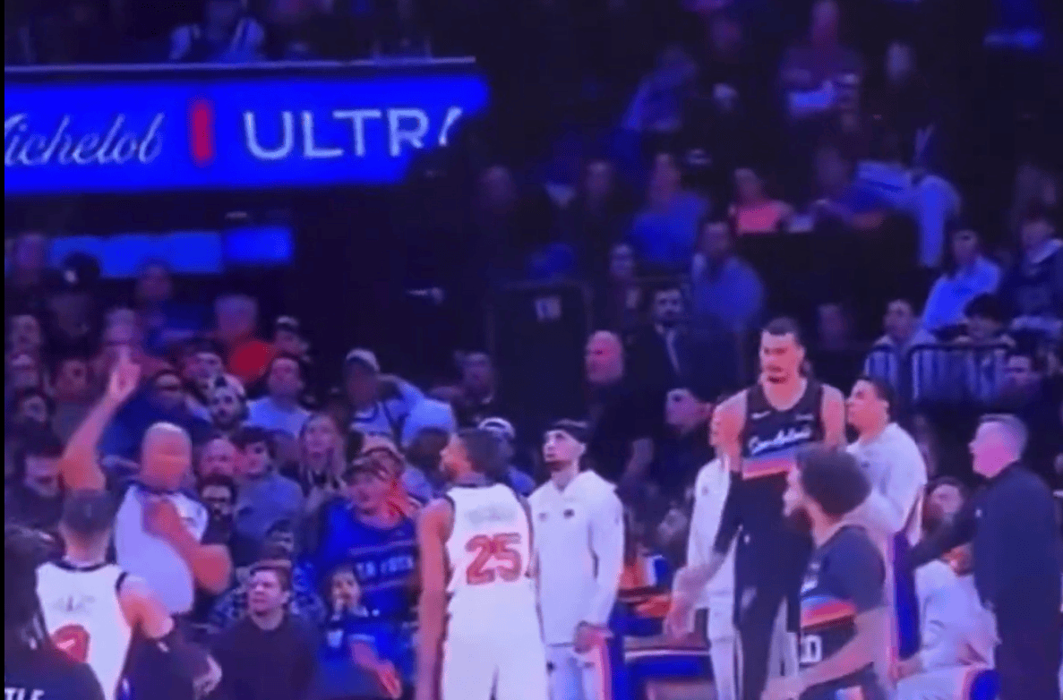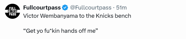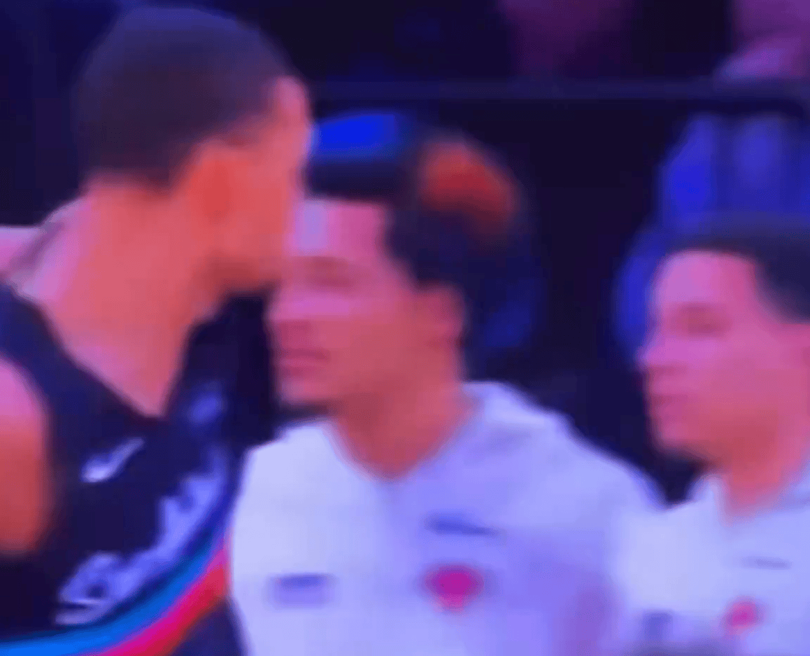 比赛中,文班亚马投篮后遭遇尼克斯球员小凯文-麦卡勒抚摸手臂,随后文班甩开后者并怒喷:“把你的b手拿开!”