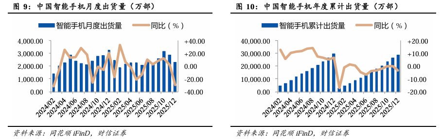 2025年12月中国智能手机出货量同比-29.40%,1-12月智能手机累计出货量同比-3.30%。2025年12月,中国智能手机出货量为2,286.50万部,同比-29.40%,环比-20.47%;2025年1-12月,中国智能手机累计出货量为28,500.00万部,同比-3.30%。