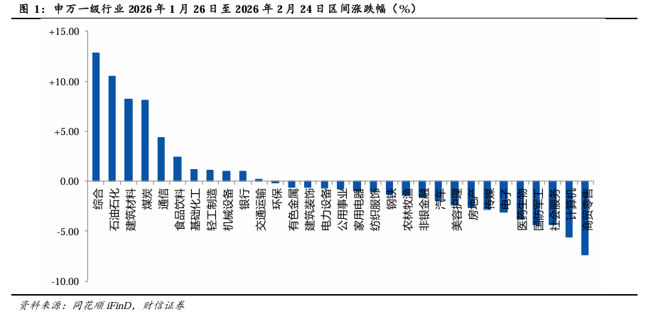 报告期内,申万电子指数-3.08%,排名申万一级行业第26。2026年1月26日至2026年2月24日,沪深300指数+0.11%,申万一级行业指数涨跌中位数为-0.78%,综合排名第一(+12.77%),商贸零售排名最末(-7.41%),申万电子指数-3.08%,排名第26。