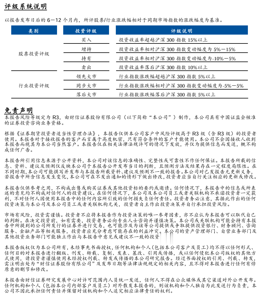 根据《证券期货投资者适当性管理办法》及《证券经营机构投资者适当性管理实施指引(试行)》的规定,通过新媒体形式制作的本订阅号推送信息仅面向财信证券研究服务客户中的风险承受能力为C3、C4、C5的投资者,请勿对本订阅号推送信息进行任何形式的转发或者、转载行为。若您并非财信证券研究服务客户中风险承受能力为C3、C4、C5的投资者,请取消关注本订阅号,请勿订阅、接收或使用本订阅号中的任何推送信息。