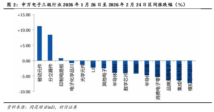 市场行情回顾:2026年1月26日至2026年2月24日,申万电子指数-3.08%,排名申万一级行业第26。申万电子二级行业指数涨跌中位数为-2.70%,其中申万消费电子指数-5.37%。申万电子三级行业指数涨跌中位数为-3.95%,涨跌幅前三分别为被动元件(+11.15%)、分立器件(+8.37%)、印制电路板(+0.76%),涨跌幅后三分别为品牌消费电子(-6.33%)、集成电路封测(-6.43%)、模拟芯片设计(-7.28%)。