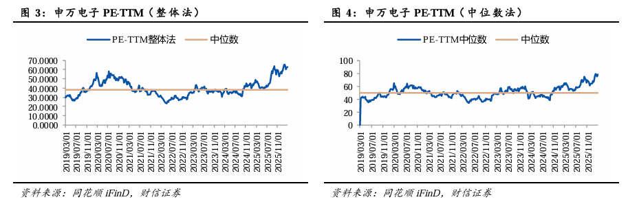 PE估值超过中值水平。近7年,申万电子板块整体法估值PE-TTM中值为38倍,中位数法估值PE-TTM中值为49倍。申万电子整体法PE-TTM为63倍,月环比-4.09%,估值水平处于历史后98.88%分位;中位数法PE-TTM为78倍,月环比-1.05%,估值水平处于历史后99.44%分位,从PE看,申万电子行业估值已超过历史中值水平。