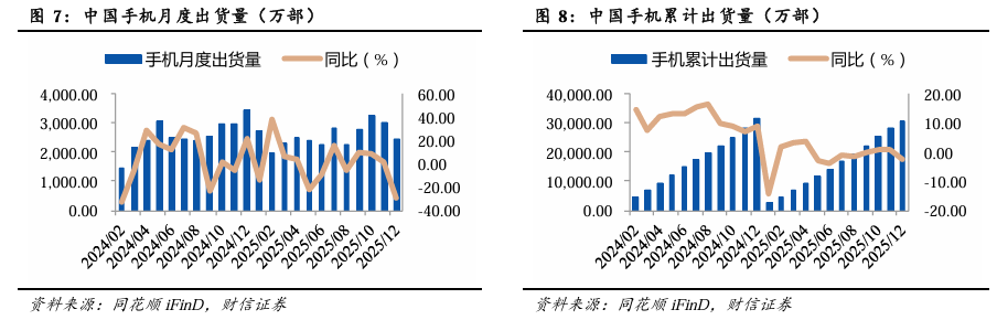 2025年12月中国手机出货量同比-29.10%,1-12月手机累计出货量同比-2.40%。2025年12月,国内市场手机出货量为2,447.30万部,同比-29.10%,环比-18.86%。2025年1-12月,国内市场手机累计出货量30,700.00万部,同比-2.40%。