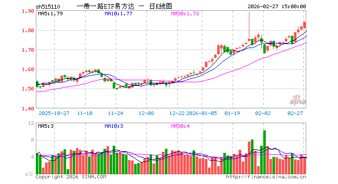 2月27日,一带一路ETF易方达(515110)涨1.27%,成交额703.92万元。当日份额增加100.00万份,最新份额为2.23亿份,近20个交易日份额增加500.00万份。最新资产净值计算值为4.11亿元。