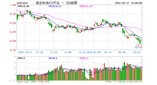 2月27日,恒生科技ETF天弘(520920)跌0.64%,成交额3.15亿元。当日份额增加1.10亿份,最新份额为191.16亿份,近20个交易日份额增加39.07亿份。最新资产净值计算值为148.91亿元。