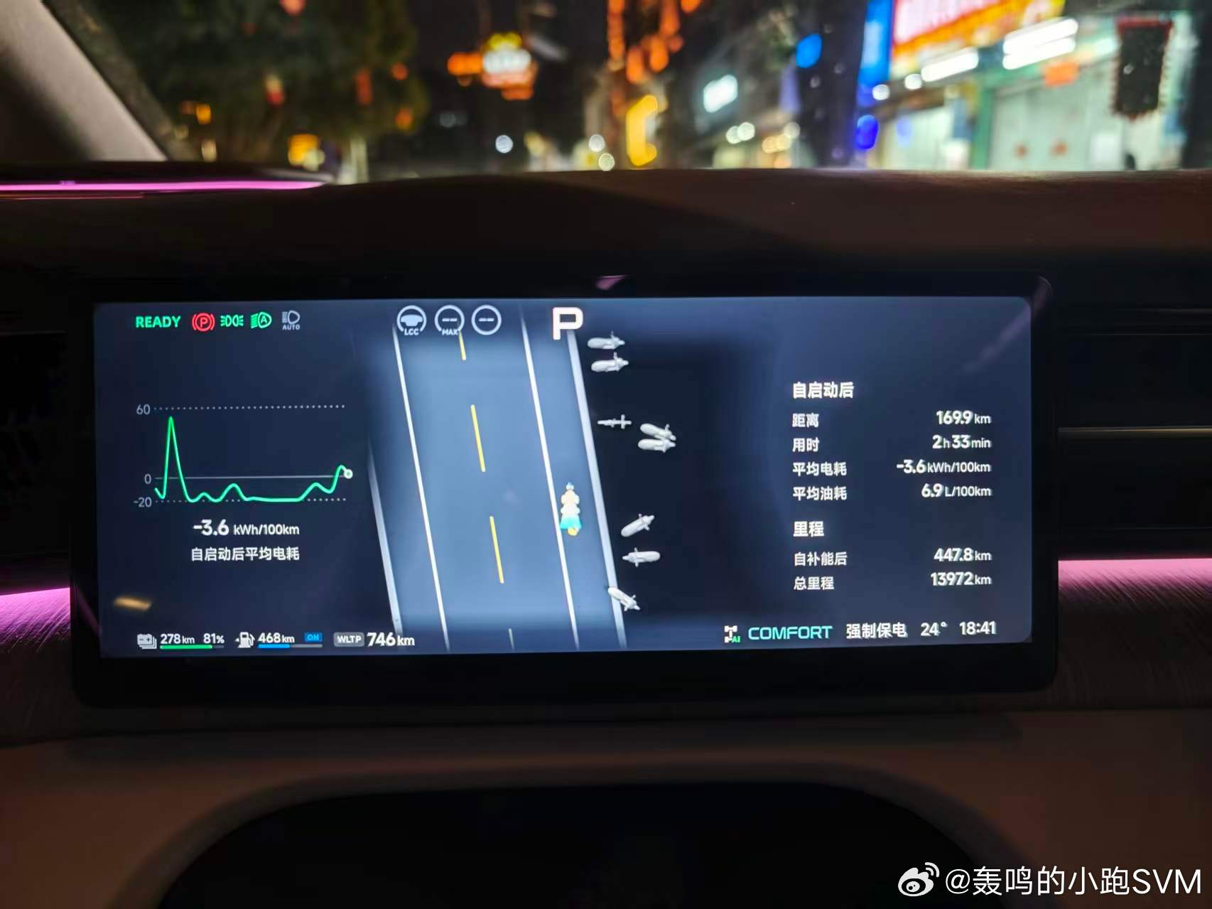 以及,NVH做得非常离谱。起初在发布会我听过它启动与其他产品的对比,但都不如自己开的感受来得强烈。在80%保电状态下,它不是时开时停么?我感受不到差异,真的听不到什么发动机的声音---我唯一能感受到发动机启动的响声,主要是在爬山+补电的工况,那时候它大概是要到四千多转去了。家人对这个情况都表示“意想不到”,没想到这是一台有发动机的产品。