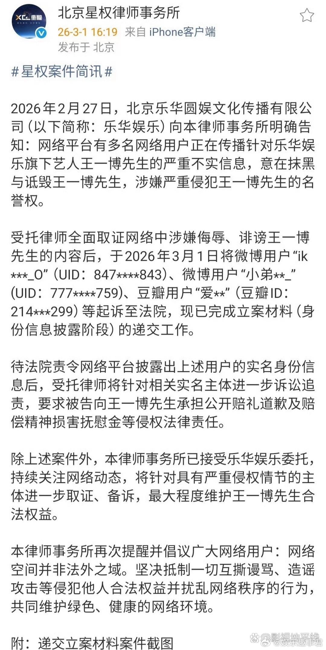 据北京星权律师事务所消息,网络平台有多名网络用户正在传播针对乐华娱乐旗下艺人王一博先生的严重不实信息,意在抹黑与诋毁王一博先生,涉嫌严重侵犯王一博先生的名誉权。