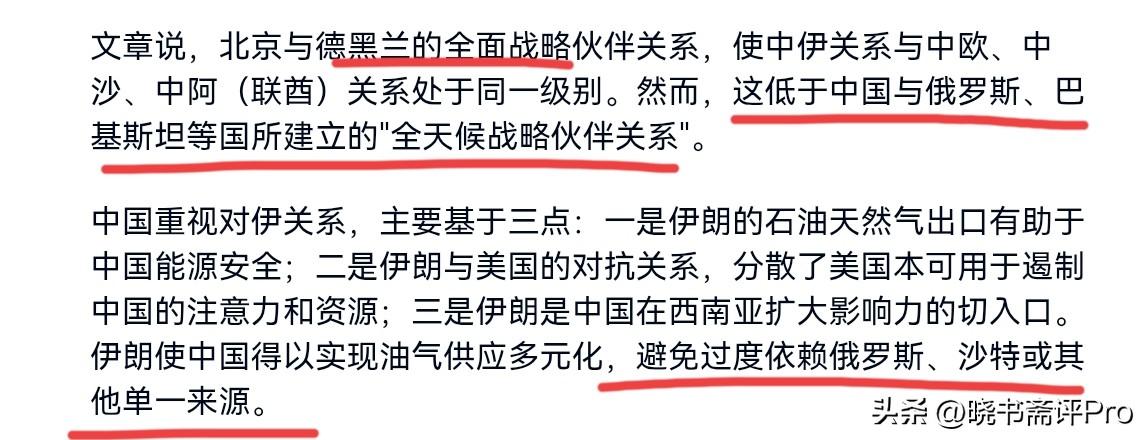 德媒这一次倒是难得的说了实话!德媒表示,中伊关系并不是盟友关系,在北京看来,打击伊朗更像是美国惹出的麻烦!3月2日,德国之声刊文表示,中国在伊朗有相当大的利益,但这些利益并非生死攸关,甚至都算不上举足轻重。北京与德黑兰的全面战略伙伴关系,这让中伊关系与中欧、中沙、中阿(联酋)关系只是处于同一级别。 然而,必须承认这低于中国与俄罗斯、巴基斯坦等国所建立的"全天候战略伙伴关系"。德媒表示,中国对于伊朗,一是需要石油,确保自身石油的多元化供应。二是,分散美国本可用于遏制中国的注意力和资源。这才是中伊关系的本质。德媒表示,中国向来避免在军事上支持伊朗,中国将伊朗视为一场长期博弈。 德媒指出,对中国而言,打击伊朗这是华盛顿自己的麻烦。这将使美国在海湾地区的军事存在付出更高的战略代价,并令其无暇全力应对中国在印太地区的挑战,并逐步消耗其军事和财政资源。对于德媒的这一番论调,我们怎么看呢?无疑,德媒这一次倒是说了一些大实话。一句话,中伊关系确实是比较友好,但是要说中伊关系是盟友层面,则完全不是事实。 事实是,中伊关系以经贸合作为优先,军事关系则处于比较靠后的位置。因此,美以打击伊朗,根本不存在中国军事上帮助伊朗这种可能性。并且,从伊朗的军事装备来说,伊朗是以美系遗留和俄系为主,伊朗也有不少自产装备,中系当然也有,但远谈不上对我们的依赖。 就美以打击伊朗而言,美国当然有自己的动机,比如让伊朗去核,被以色列战略绑架,出于中期选举拉抬支持率等等。但是,从我们的角度而言,美国的所作所为既损害美国的形象,破坏国际法,更是对自身资源的消耗。更为关键的是,美国的击杀可能也实现不了伊朗政权更迭的目的。一句话,我们是任凭风浪起,稳坐钓鱼船。伊朗问题,当然不是我们国家最优先的议程。