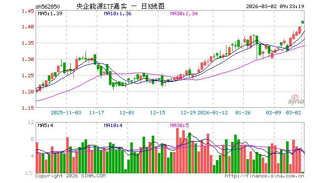 3月2日,央企能源ETF嘉实(562850)开盘涨1.14%,报1.415元。央企能源ETF嘉实(562850)重仓股方面,长江电力开盘涨0.31%,中国铝业涨1.17%,国电南瑞跌0.95%,中国核电涨0.00%,云铝股份涨1.60%,三峡能源跌0.24%,中国石油涨8.66%,中国海油涨10.01%,国电电力跌0.20%,中国电建跌0.87%。