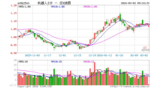 3月2日,机器人ETF(562500)开盘跌2.03%,报1.063元。机器人ETF(562500)重仓股方面,科大讯飞开盘跌1.90%,汇川技术跌1.60%,拓普集团跌2.68%,大华股份跌1.56%,大族激光跌1.80%,双环传动跌2.51%,石头科技跌1.00%,中控技术跌2.74%,绿的谐波跌3.60%,机器人跌2.40%。