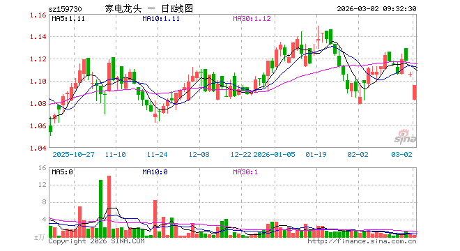 3月2日,家电ETF博时(159730)开盘跌2.08%,报1.083元。家电ETF博时(159730)重仓股方面,三花智控开盘跌2.56%,格力电器跌0.40%,美的集团跌0.81%,海尔智家跌0.78%,德业股份跌1.74%,科沃斯跌1.95%,石头科技跌1.00%,公牛集团跌0.78%,海信家电跌0.80%,老板电器跌0.81%。