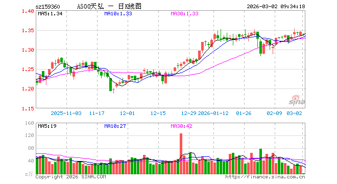 3月2日,中证A500ETF天弘(159360)开盘跌0.37%,报1.340元。中证A500ETF天弘(159360)重仓股方面,宁德时代开盘跌0.30%,贵州茅台跌0.35%,中国平安跌1.08%,中际旭创跌2.62%,紫金矿业涨2.15%,招商银行跌0.39%,新易盛跌3.37%,美的集团跌0.81%,兴业银行跌0.27%,长江电力涨0.31%。