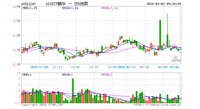 3月2日,A50ETF鹏华(512240)开盘跌0.44%,报1.140元。A50ETF鹏华(512240)重仓股方面,宁德时代开盘跌0.30%,贵州茅台跌0.35%,中国平安跌1.08%,中际旭创跌2.62%,紫金矿业涨2.15%,招商银行跌0.39%,美的集团跌0.81%,长江电力涨0.31%,立讯精密跌1.81%,中信证券跌0.95%。