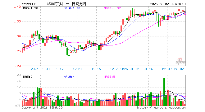 3月2日,A500ETF东财(159380)开盘跌0.58%,报1.379元。A500ETF东财(159380)重仓股方面,宁德时代开盘跌0.30%,贵州茅台跌0.35%,中国平安跌1.08%,中际旭创跌2.62%,紫金矿业涨2.15%,招商银行跌0.39%,新易盛跌3.37%,美的集团跌0.81%,兴业银行跌0.27%,长江电力涨0.31%。