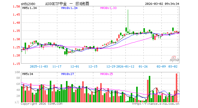 3月2日,A500ETF中金(512080)开盘跌1.11%,报1.333元。A500ETF中金(512080)重仓股方面,宁德时代开盘跌0.30%,贵州茅台跌0.35%,中国平安跌1.08%,中际旭创跌2.62%,紫金矿业涨2.15%,招商银行跌0.39%,新易盛跌3.37%,美的集团跌0.81%,兴业银行跌0.27%,长江电力涨0.31%。