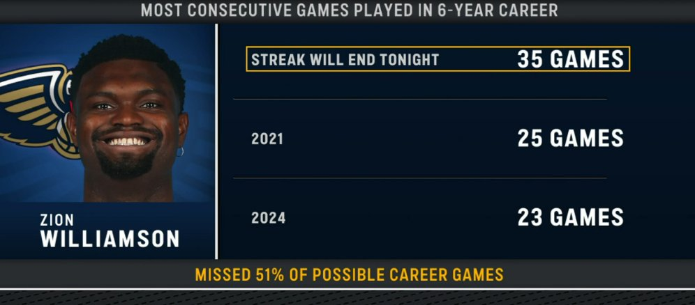 蔡恩-威廉森因右脚踝扭伤缺席本场比赛,蔡恩连续出战35场的生涯最佳出勤纪录中断。