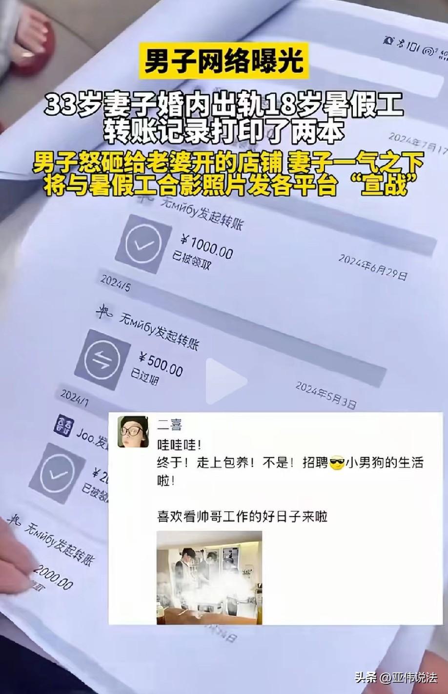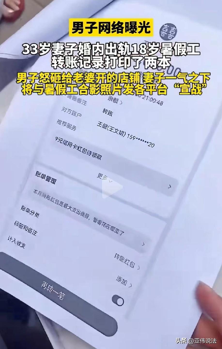 太嚣张了!男子婚后给妻子开了一个店铺,没想到,33岁的妻子竟然婚内出轨18岁暑假工小伙,给小伙的转账记录更是多到数不清。拼命赚钱养家,最后家被偷了,男子难压心中怒火,一气之下砸了妻子的店铺。岂料,妻子并不服气,反而觉得丈夫让她失了面子,直接把她和小男友的私密合照公开发到群里,借此挑衅丈夫。 王先生怎么也没想到,33岁的妻子会做出背叛家庭的荒唐事,甚至还破罐子破摔,把家丑彻底闹到了人尽皆知。 王先生和妻子还没离婚,两人原本的日子还算安稳,王先生心疼妻子,还特意出钱给她开了一家店铺,让她不用辛苦上班,能有一份自己的小生意。 可他掏心掏肺的付出,并没有换来妻子的珍惜,反而让妻子有了别的心思。 妻子在店里看上了一名年仅18岁的暑假工小伙,两人不顾年龄差距和婚姻底线,很快就发展出了不正当的关系。 一开始王先生只是觉得妻子最近行为古怪,手机从不离身,回家也总是心不在焉,他心里虽然犯嘀咕,却也没往最糟糕的地方想。 直到一次意外,王先生当场撞见妻子和这名18岁的小伙待在同一辆车里,场面十分尴尬,成年人都懂得发生了什么。 这一幕像一把重锤,狠狠砸在了王先生心上,他所有的侥幸和自欺欺人,在这一刻彻底破灭。 确认妻子出轨后,王先生又气又痛,开始默默搜集证据。 这不查不知道,一查更是让他心凉透顶。 妻子给小男友的转账记录多到数不清,他整理打印出来,竟然足足装了两本。 看着眼前厚厚的证据,想到自己对家庭的付出,王先生越想越委屈,也越想越愤怒。 他出钱给妻子开店,对她百般包容,妻子却拿着他的辛苦钱,在婚内背叛家庭。 被愤怒冲昏头脑的王先生,再也控制不住情绪,直接冲到了自己给妻子开的店铺里,动手把店里的东西砸了个稀烂。 他想用这种极端的方式,发泄心中的恨意与不甘。 可王先生没想到,他砸店的举动,非但没有让妻子醒悟,反而彻底激怒了对方。 原本还想着遮掩的妻子,干脆破罐子破摔。 她一怒之下,把自己和18岁小男友的亲密合照,全都发到了各个社交平台,丝毫不在意世俗的眼光,也完全不顾及两人还没离婚的事实,公然把这段婚外情摆到了明面上。 看到这一幕,不少人调侃王先生的妻子,称她过上了招聘小奶狗、天天看帅哥工作的好日子。 原本作为受害者的王先生,看着妻子公开的合照,再想想被自己砸掉的店铺和那两本沉甸甸的转账记录,心里只剩下无尽的绝望和后悔。 他本想维护自己的婚姻和尊严,却因为一时冲动,把事情闹到无法收场。 好好的一个家庭,因为一段荒唐又不负责任的出轨闹剧,变得支离破碎,最后落得个两败俱伤的下场。 其实,整件事里,王先生本是受害方,只有通过合法途径维权,才能最大程度保护自己。 《民法典》第1062条规定:夫妻在婚姻关系存续期间所得的工资、奖金、劳务报酬、生产、经营、投资的收益等,为夫妻的共同财产,归夫妻共同所有,夫妻对共同财产,有平等的处理权。 本案中,王先生辛苦打拼、出资给妻子开店,相关收入均属于夫妻共同财产。 妻子在婚内擅自将大额钱款转给18岁暑假工,既不是用于家庭生活,也未取得王先生同意,属于无权处分夫妻共同财产,严重侵害王先生的合法财产权益。 王先生作为受害方,有权向法院起诉,要求第三者全额返还所有不当转账。 同时,妻子婚内出轨违背夫妻忠实义务,存在重大过错。 而王先生砸店泄愤的行为,虽事出有因,但涉嫌故意损毁财物,同样要承担相应法律责任。 对此,您怎么?