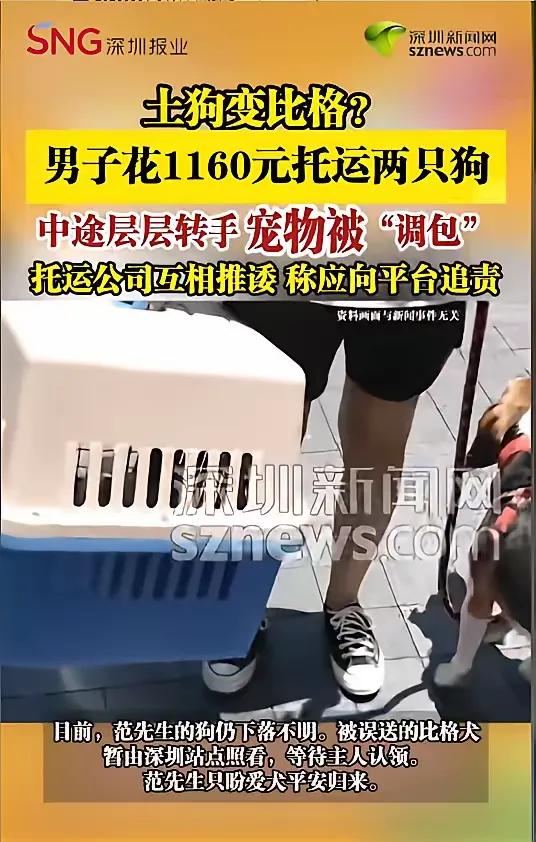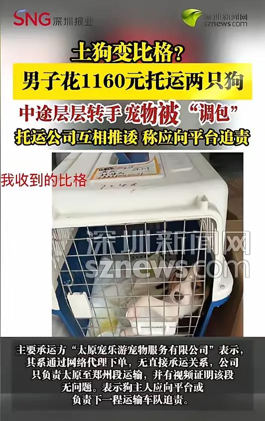 “离了个大谱!”近日,广东深圳,一男子花费1160元,托运了自己的两只中华田园犬。签收时,他却惊住了,自己收到的竟是一只比格犬。笼子等其他物品托运时一模一样,就是自己的爱犬被人“掉包了”。自己找托运公司理论,却遭遇了层层推诿! 范先生说,他是2月24日通过中介把两只狗从太原托运回深圳的,想着花了一千多,又是找的正规渠道,总该能让毛孩子平安到家。可等他在深圳站点打开笼子时,整个人都懵了——里面哪有自己养了很久的中华田园犬,分明是一只陌生的比格犬,连笼子上的标签都还是他当初贴的。 他第一时间联系了托运方,得到的回复却像踢皮球。一开始有人说“发错了”,可查来查去,负责太原到郑州段的承运方又说,自己只负责这一段,而且有视频能证明这段运输没问题,让他去找平台或者下一程的车队追责。范先生翻遍了聊天记录、托运单,想找个能管事的人,可电话打了一圈,微信发了几十条,要么是没人接,要么就是“这不归我管”“你找别人去”。 更让他揪心的是,自己的两只中华田园犬至今下落不明,而这只被错送的比格犬,还得暂时留在深圳站点等它真正的主人来认领。范先生说,他不在乎赔偿多少,就盼着自己的爱犬能平安回来,毕竟养了这么久,早就当成家人了。 很多人以为花了钱、找了“正规”中介,就能把毛孩子托付出去,殊不知背后可能藏着层层转包的猫腻。中介接单后,把单子转卖给下家,下家再拆成几段运输,中间环节多到数不清,一旦出了问题,谁都不想担责,最后只能把锅甩给消费者。 这些托运公司嘴上说着“专业”“安全”,可连最基本的货物核对都做不好。连活物都能随便“发错”,这背后是对生命的漠视,更是对消费者信任的践踏。花了一千多块钱,换来的不是爱犬的平安抵达,而是一场“狸猫换太子”的闹剧,换谁都得气炸。 我们总说要善待动物,可连最基本的运输安全都保障不了,谈何善待?也希望相关部门能好好管管这个行业,别再让更多养宠人经历这种“丢狗”的痛苦。毕竟,对很多人来说,宠物不是商品,是家人,是不能被随便“掉包”的牵挂。 各位读者你们怎么看?欢迎在评论区讨论。
