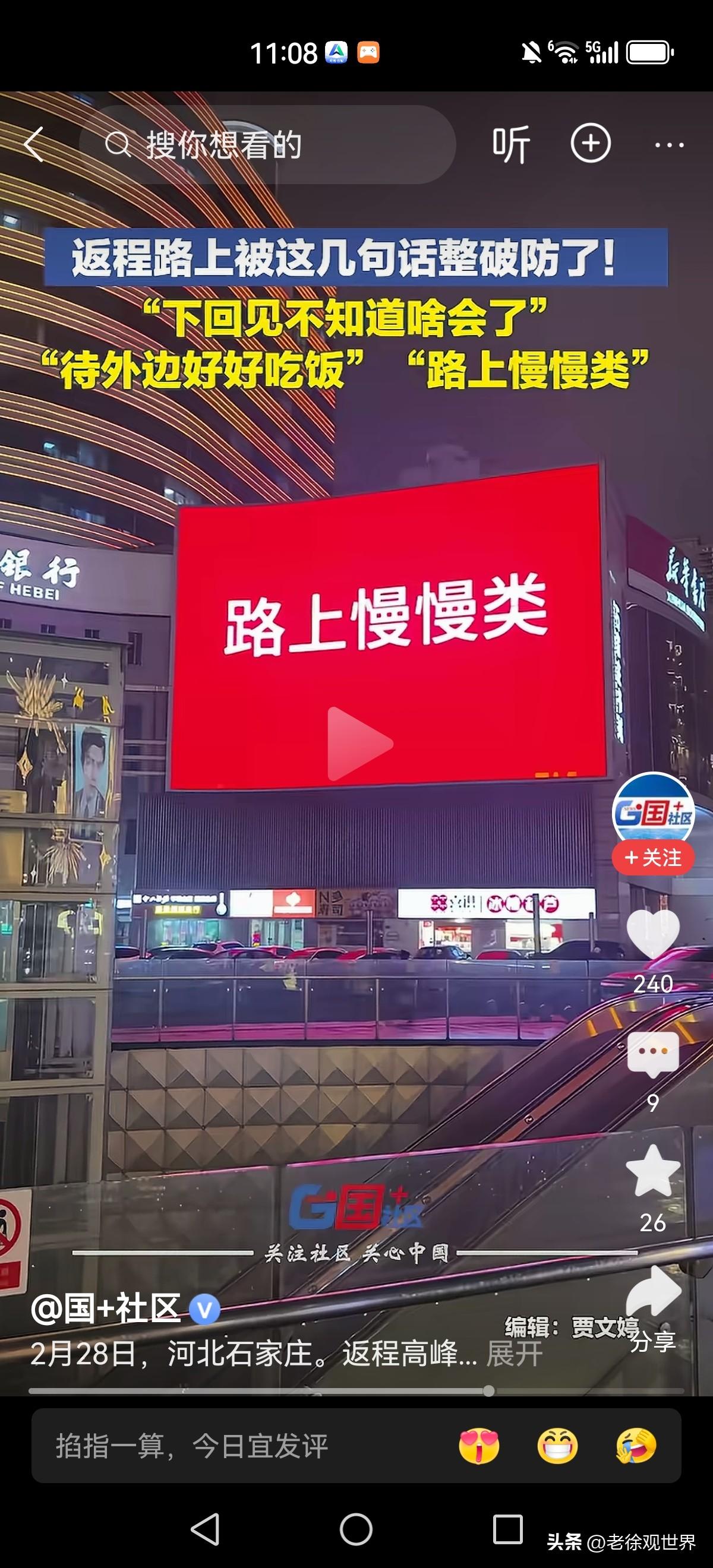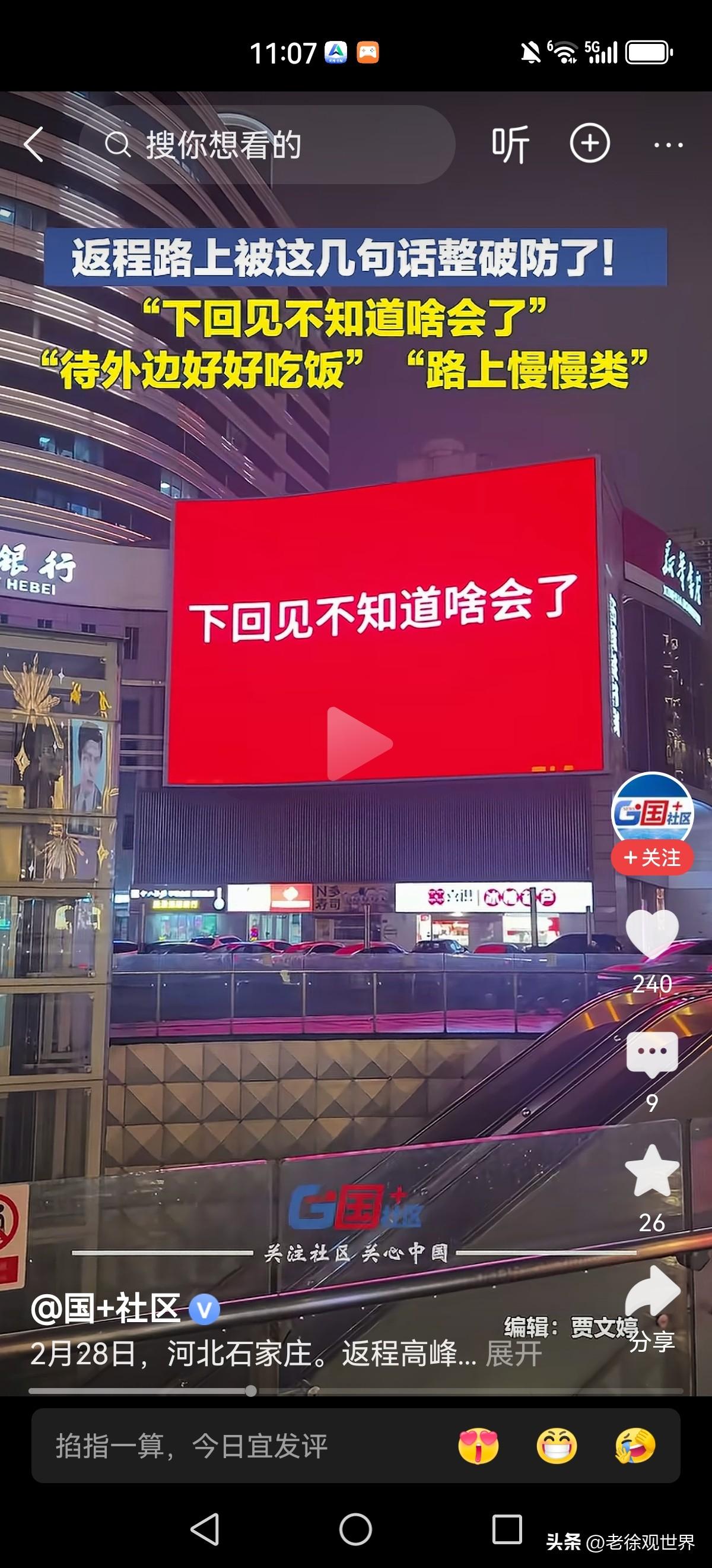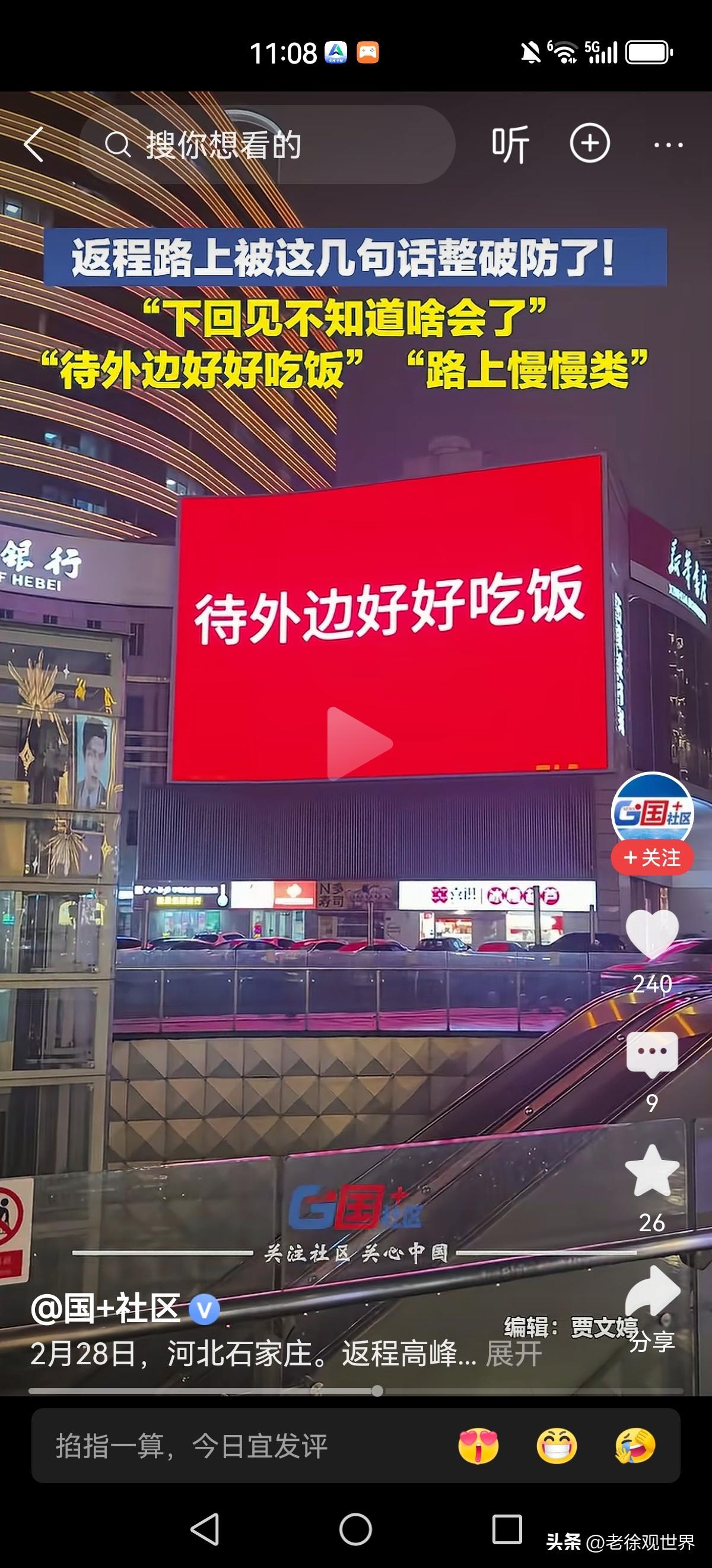 吃过饭再走吧 路上慢点 到了给我电话 下次再见不知何时 城市大屏幕上,一句句朴实的叮嘱令人动容。 匆匆忙忙又是一年,为了生活又要四分五落。 唯有心中那份亲情和牵挂绵延悠长!念远在天边的您 电话那头的一句 前任一句在吗 下班回信息 请别再催我回家 九点就到家 电话那头是故乡 车站接老乡