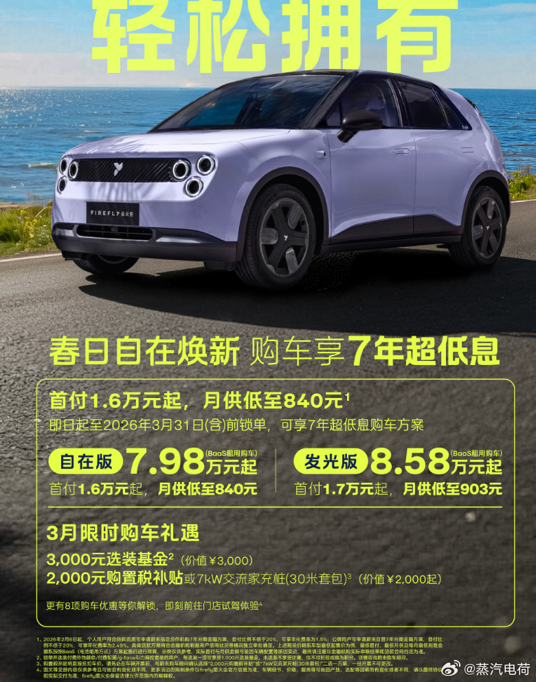 进入到3月,蔚来萤火虫品牌跟进的新的优惠政策,主要是“7年超低息”,还有2000