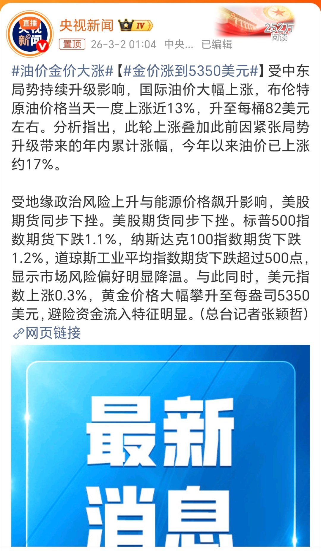 油价金价大涨油价涨幅不大,金价涨幅比较大。金价涨到5350美元
