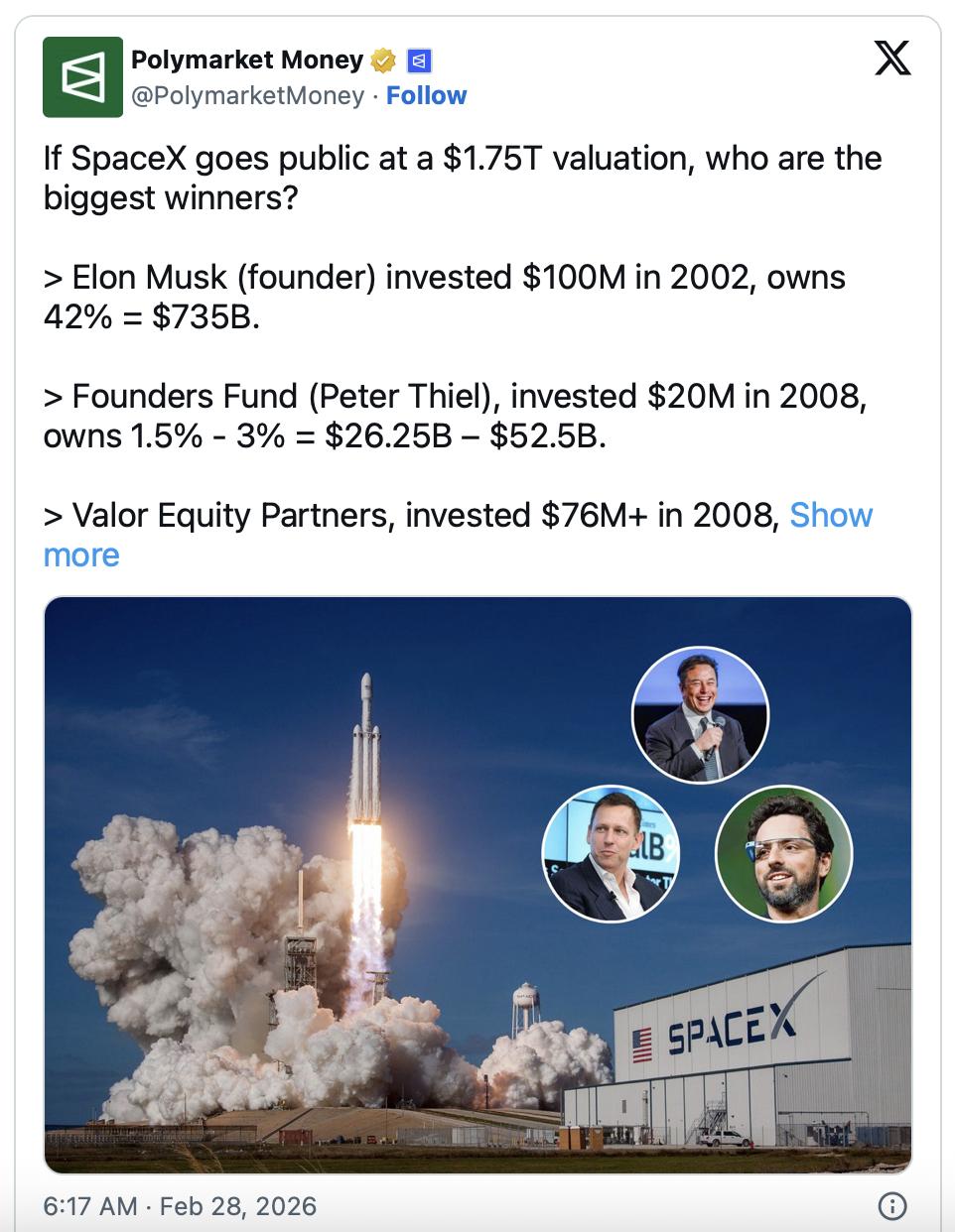 SpaceX上市后马斯克的净资产将突破万亿美元大关 彭博社爆料,SpaceX准备最早于3月秘密提交IPO申请,为6月上市铺平道路,估值可能超过1.75万亿美元,有望成为史上规模最大的IPO。此次IPO可能筹集高达500亿美元的资金,超过沙特阿美2019年创下的290亿美元的IPO纪录,后者目前是史上规模最大的IPO。 Polymarket Money预测显示,SpaceX此次IPO不仅将成为史上规模最大的IPO,还可能为公司的一些主要投资者带来前所未有的巨额财富。 马斯克于2002年向SpaceX投资了1亿美元,目前持有该公司约42%的股份。假设SpaceX的IPO估值达到1.75万亿美元,那么马斯克持有的股份价值将约为7350亿美元。 这将大幅提升马斯克的净资产。如果加上他在特斯拉公司和其他企业的股份,SpaceX以这样的估值上市,他有望成为全球首位万亿富翁。 Peter Thiel创立的创始基金2008年向SpaceX投资了2000万美元,按1.75万亿美元的估值计算,这相当于约262.5亿美元至525亿美元的价值,这样的回报也将是硅谷史上最丰厚的风险投资成果之一,增长率高达131150%至262400%。 谷歌母公司Alphabe2015年向SpaceX投资了9亿美元,这部分股份价值可能在1050亿美元至1225亿美元之间,增幅高达11566%至14455%,也是超高回报率的一笔投资了。【来自懂车帝车友圈】