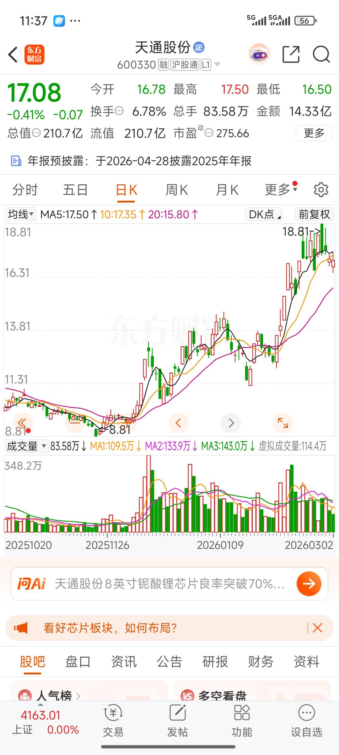 今天受美伊战争影响,大盘实际上在调整。非战争概念股大多受到波及,低开低走,天通股份也未展现出特别的强势。 我今天跟兄弟姐妹们汇报一下,我那1/4的天通股份今天清仓了,不管后期情况如何,主力可以放心涨,我已经卖出了。然后追高买入了油气股,目前处于高位,略有亏损。 我认为美伊战争不会很快结束,短则数周,长则数月。所以我觉得油气股仍有上涨空间,再加上当前金油比十分离谱,油价本身就具备上涨潜力,特此跟兄弟姐妹们汇报。美伊核博弈 美伊角力 美伊开打 航天军工股票 油气股上扬 中东股市 航空天板块