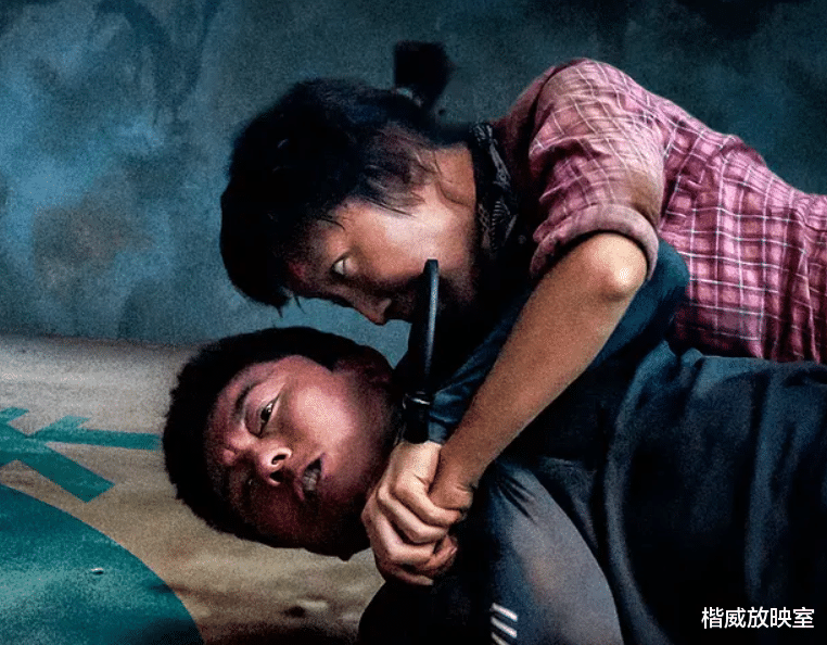 随着危险升级,找到窝藏拐卖儿童的废墟后,就上演了开篇提到的重磅对打戏,黄米依饰演的秦叶蓉是这里的头目,会功夫,是气场十足的女老大,其哑巴的设定,也增强了这个角色的勇猛与狠毒,杀气袭人。她手持镰刀与老公梁鹏合力与李红旗厮杀,可以说是全片最重要的一场打斗戏。饰演梁鹏的也是在体能上比较适合拍武打戏的跑酷运动员赵靖舒玉。
