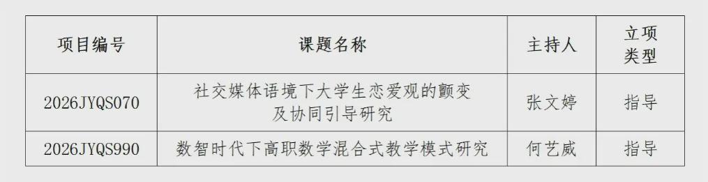 近日,中共河南省委教育工作委员会、河南省教育厅联合发布了《关于公布2026年度河南省教育强省专项研究项目立项名单的通知》(豫教工委〔2025〕107号),公布了2026年度河南省教育强省专项研究项目的立项结果,信阳科技职业学院共有2个课题成功获批立项。