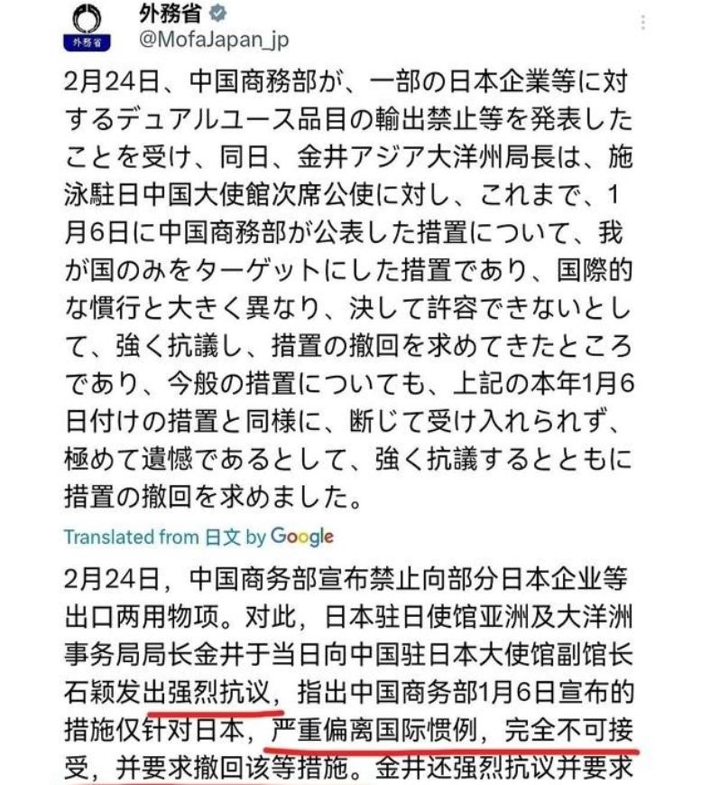 日本那边,不装了。一份声明直接发到我们脸上,措辞极重:“绝对无法接受!”就因为我们把那20家日本实体,放进了管制名单。电话打到我们使馆,公使直接被叫过去当面交涉。对方几乎是敲着桌子质问,说这事只针对日本,不符合国际规矩,要求我们立刻、马上、无条件撤销。 - 2026年2月24日东京春寒未散外务省大楼里却更冷,中国商务部第11号和第12号公告一出日本政坛立刻炸锅,清单里20家日本实体被点名三菱重工川崎重工IHI富士通NEC都在列,这不是随便喊几个名字而是把日本军工产业的骨架直接亮出来, 当天晚上佐藤启站到镜头前脸都绿了,直接甩出绝对无法接受极度遗憾这种硬话,紧接着外务省连夜动作,把中国驻日使馆的公使叫去谈,态度很急很冲,明显是被点到痛处了,在封闭会议里日方代表几乎拍桌子吼凭什么只针对日本立刻撤销,反应越激烈越说明打到了要害,因为被点名的公司就是日本防卫体系的顶梁柱, 这些企业各自卡着关键环节,三菱造潜艇也做航发相当于战机心脏,川崎和IHI参与F2升级和下一代巡航导弹研发,富士通和NEC在电子通信等方向也与防务相关,日本想搞武器国产化绕不开这批名字,所以中方动作被形容为精准专挑军民两用项目下手,公告落地相关交易立刻冻结想绕道第三方也被堵,这正撞上日本再军事化加速的关口, 高市早苗2025年底当首相后一路猛推扩军,2026财年防卫预算冲到9.04万亿日元涨幅接近10%,2027财年还放话要破10万亿,以前老挂嘴边的专守防卫基本等于不算数了,又搞宇宙作战集团又推动航空自卫队改名航空宇宙自卫队,还讨论介入台海这些动作连遮羞布都懒得扯,中方在2月26日明确说明这不是无差别打击而是定向阻断日本再军事化和拥核企图, 中方同时强调普通学校医院和民生贸易不受影响,但想用中国关键材料造利剑没门,这话一捅破日本国内先乱阵脚,东京股市在公告后应声下跌,三菱和IHI等股价大幅走低资本市场最敏感,因为市场懂得这不是一阵风而是卡住供应链的阀门,企业利润和项目进度都可能被迫重算, 日本军工命门被认为是稀土镓锗石墨等关键元素,这些中国产能和供应能力对日本影响深,文中提到断供一年单稀土就可能让日本名义GDP蒸发0.43%,更麻烦的是下游几千家中小企业会出现寒蝉效应,一旦上游不稳订单交付就不稳融资也会紧,供应链连锁反应会把压力从军工扩散到更广的制造端,所以政府才会急得跳脚, 有意思的是政府高调喊话企业反而更低调,三菱说在评估影响,IHI说持续核查,斯巴鲁内部紧急审查,他们清楚短期很难找到替代方案,从澳洲北美找矿到建精炼到配套材料体系都不是几个月能搞定,所以企业只能先压着情绪做风险表,而政府则需要在舆论上表现强硬来稳住国内,于是出现一边拍桌子一边盘点库存的反差, 把事件放大看这是一场历史惯性和现实野心的对撞,日本试图靠预算暴涨和武器出口松绑突破战后体制,本质是在挑战地区安全底线,中方把20家实体列入清单就像画出一条红线,告诉想重温军国旧梦的人底线不可触碰,到了2026年3月公告过去一周多日本贸易协会持续发预警,外交口水仗不断但清单已经生效, 接下来球在日方脚下,继续狂飙还是修补互信都要拿行动说话,拍桌子和喊口号换不回关键材料,精密武器和高端制造对这些元素依赖不是靠情绪能改写,断供的威力已经让军工体系和下游企业同时承压,政府慌企业无奈市场震荡正是定向阻断的效果,这场较量说明控制供应链比喊话更有重量,红线划好越碰越痛现实比演习更严苛,最终能掌握话语权的是掌握关键原材料和产业链的人。