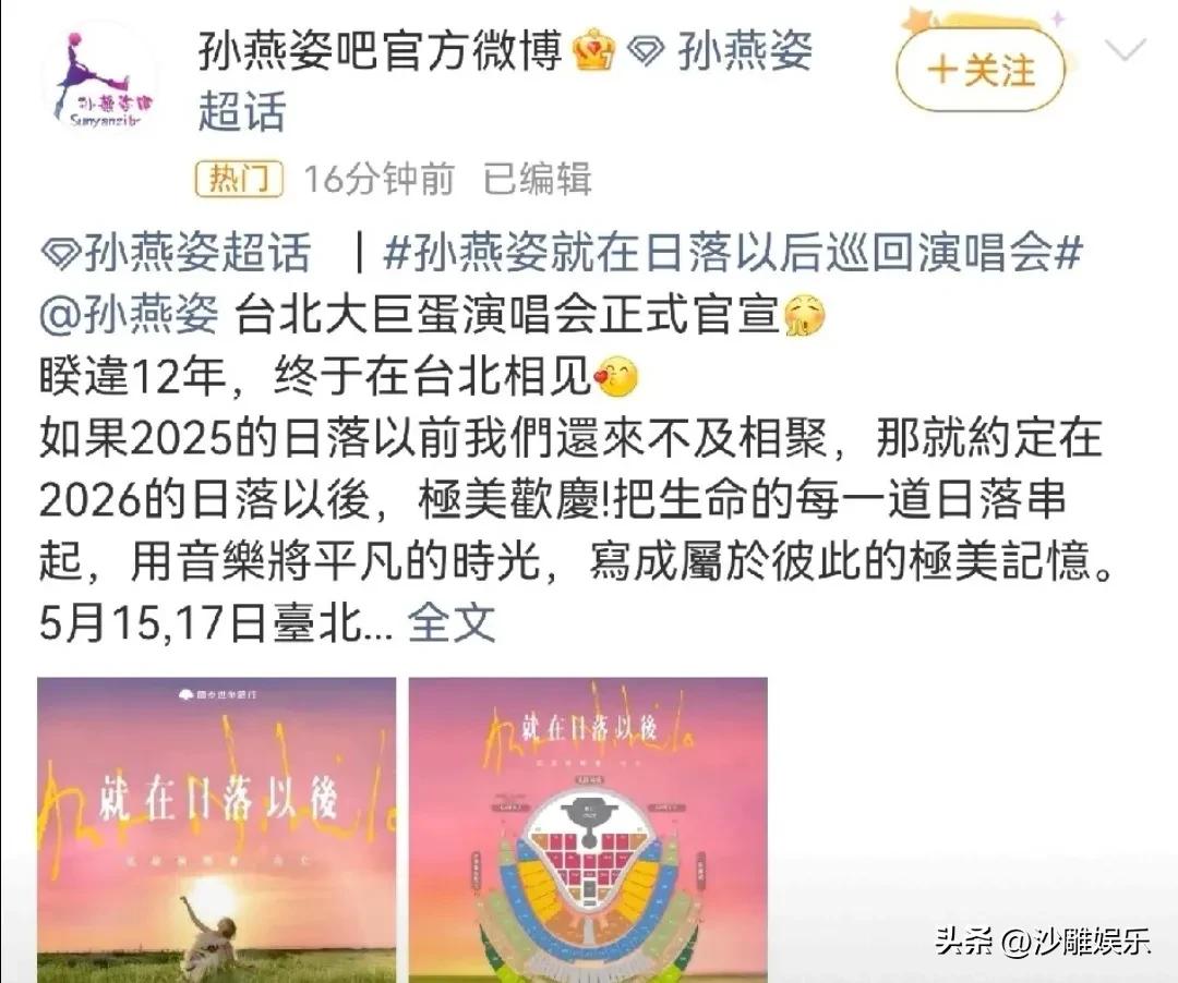 孙燕姿,正式官宣! 3月2日,那个留着短发、唱歌像讲故事的“冷门歌手”终于传来大消息!时隔整整12年,孙燕姿正式官宣:5月15日、17日,她要带着《就在日落以后》巡演唱进台北大巨蛋! 消息一出,多少人的青春瞬间被唤醒。 这不仅仅是一场演唱会,这是一封等了12年的情书。你还记得吗?当年听着《天黑黑》的我们,还是懵懂少年;如今燕姿已是两个孩子的妈妈,而我们在生活的洪流里摸爬滚打。 这次“日落之约”玩得太大了。刚发行的新歌《飞瀑而下》只是开胃菜,真正的硬菜是首度攻蛋的震撼。据说燕姿和团队把节目结构反复推敲,就为了给歌迷最精准的节奏。想想看,在大巨蛋几万人的注视下,当《开始懂了》的前奏响起,那得是多少颗心脏同时漏跳一拍? 更戳心的是,这不仅是台北的盛事,更是全球燕姿迷的狂欢。之前香港站一开票就秒杀,吸金4亿,场面火爆到不行。这次台北站将于3月20日中午12点在KKTIX全面开卖,据说3月4日起捷运站就能偶遇天后的巨幅广告。 说实话,我们去看孙燕姿,听的哪里是歌?听的正是那个曾经不顾一切、勇敢追求幸福的自己。在这个浮躁的时代,燕姿的声音就像一颗定心丸。5月的大巨蛋,不仅是音乐的现场,更是70后、80后、90后集体追忆青春的安魂所。 记住这个约定:就在日落以后,我们大巨蛋见,不见不散! 这一次,不许再让我们等12年!