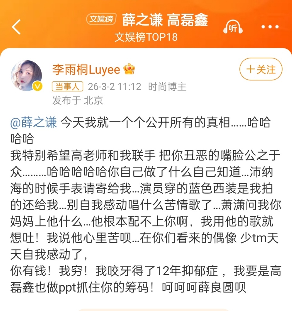 李雨桐喊话薛之谦又出什么仙人跳了,虽然但是薛挺糊的无人伤亡吧李雨桐说被薛之谦威胁