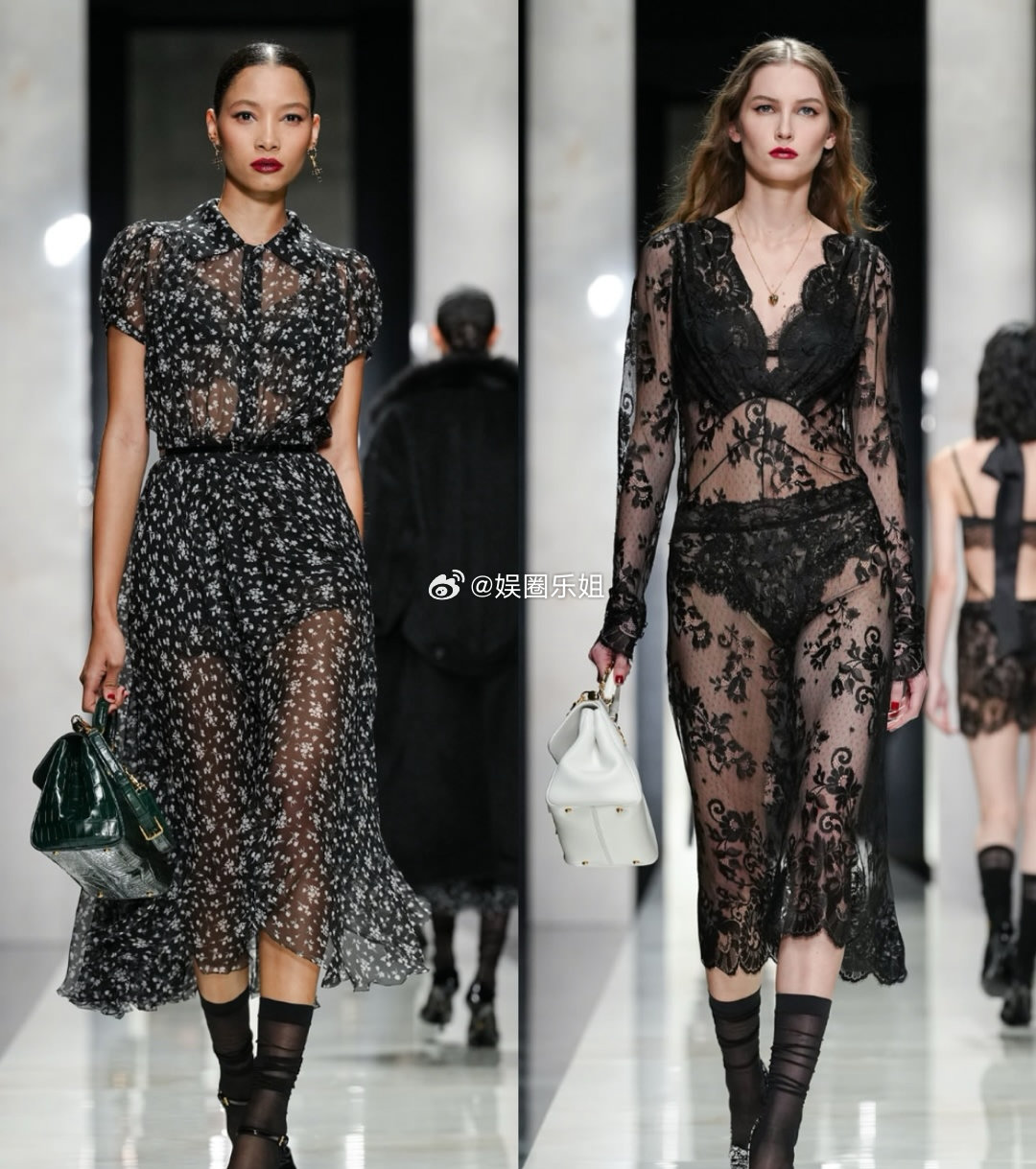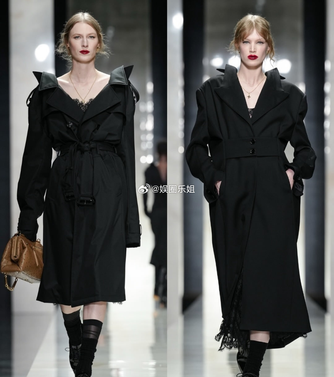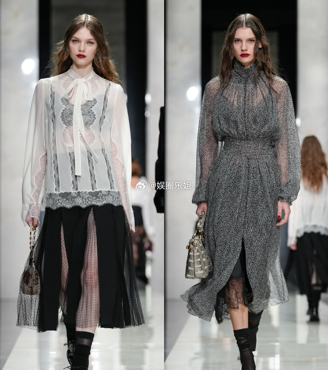 杜嘉班纳2026秋冬系列|由Domenico Dolce与Stefano Gabbana呈现。开场造型对西装进行解构,翻领与纽扣从常规的前襟移至后背,这不是简单反穿,而是版型的重构。蕾丝、天鹅绒等品牌经典面料继续沿用,将西西里的女性气质、诱惑、信仰与力量交融呈现。