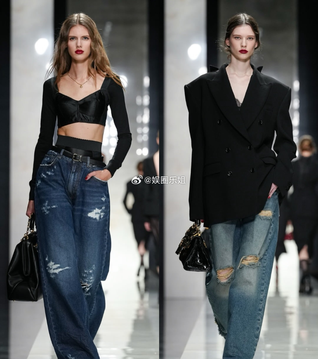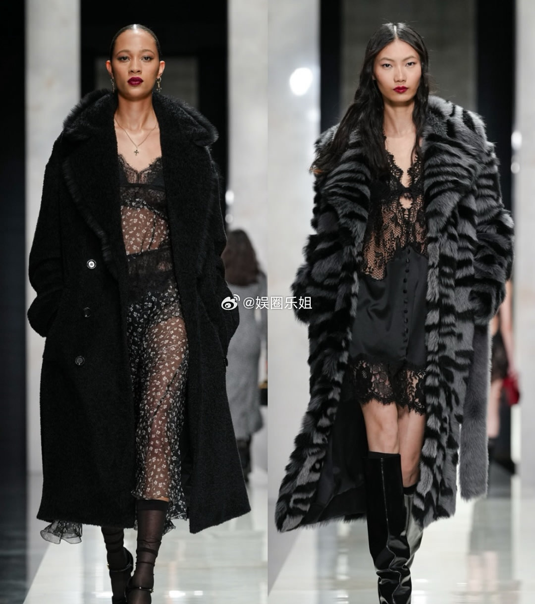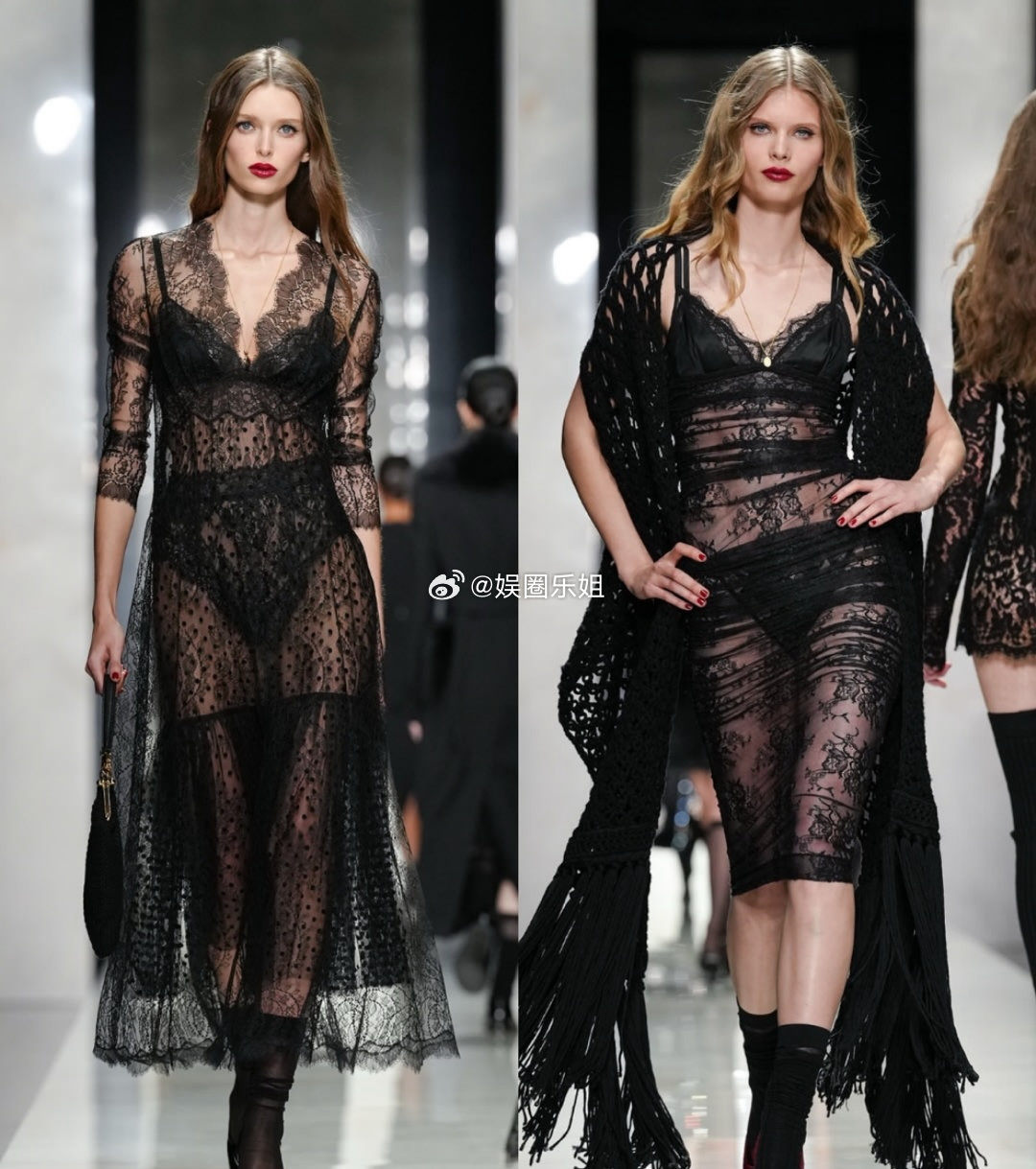 杜嘉班纳2026秋冬系列|由Domenico Dolce与Stefano Gabbana呈现。开场造型对西装进行解构,翻领与纽扣从常规的前襟移至后背,这不是简单反穿,而是版型的重构。蕾丝、天鹅绒等品牌经典面料继续沿用,将西西里的女性气质、诱惑、信仰与力量交融呈现。