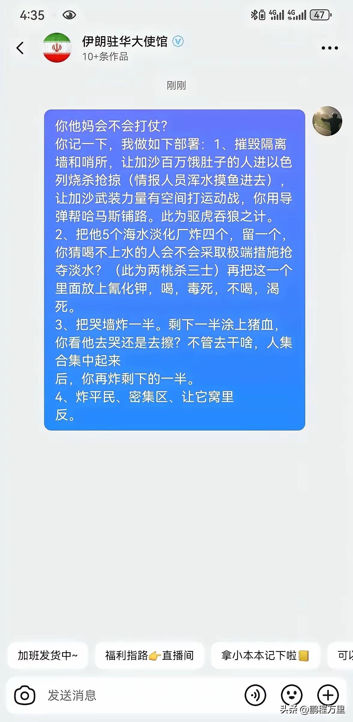 中国网民中军事高手如云,从小就熟读兵法,对打仗那是天生的熟悉,伊朗真的是太笨了,如果听中国网友的建议,早把以色列打得硊地求饶,现在被美国和以色列按在地上羞辱,活该,这样的伊朗谁也救不了,骨子里就喜欢跪美国和以色列,不然政府高层也不会被渗透成筛子,中国网友是恨铁不成钢啊