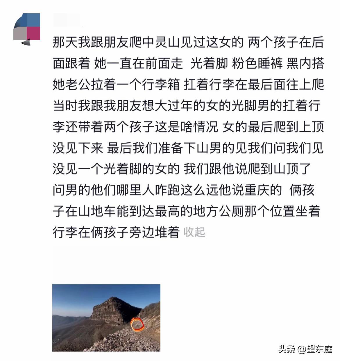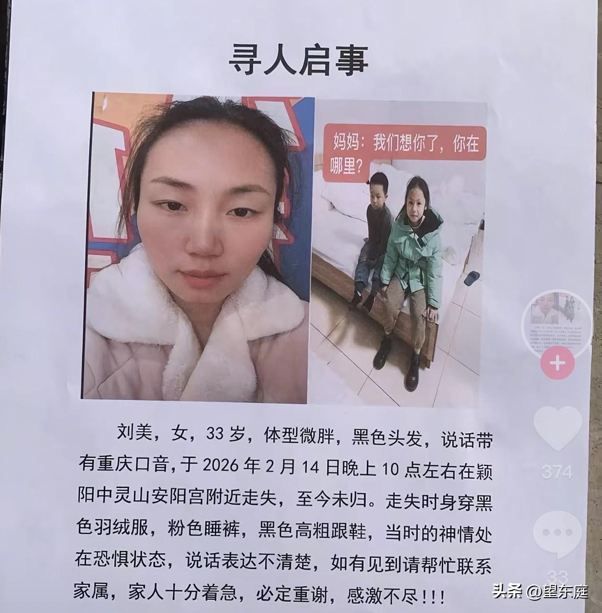 这是失联10天遗体被找到的33岁重庆女子刘美生前最后的影像!那会,她光着脚在山路上走,两个孩子跟在后面,她丈夫则扛着行李箱走在最后面。 当天是2月14日,也就是腊月二十七,刘美一家四口特意从重庆来到河南登封的中灵山。 本以为这是一次难忘的旅程,殊不知,这个家庭当天晚上就发生了巨变。 她们是下午1点左右上山的,当晚10点左右,刘美就失联了。这期间,她音信全无,一直到2月24日才被找到。可那时候,她的生命早已经不在了。 在这个事件里,有一点让人始终想不通:按照刘美丈夫的说法,行程是刘美早就计划好的。可从他们的各方面特征来看,却又像是行事匆匆。 从刘美穿着睡裤、丈夫扛着行李的这些行为来看,他们可能连酒店都还没有办理入住就匆匆往山上赶了。既然都已经从老家出来了,为什么她们要如此匆忙去爬一座山呢? 事实上,当天就有网友曾偶遇她们一家人。 当时,对方见刘美光着脚走山路、一家人还是分开走的,网友觉得非常疑惑,于是,随手拍下了一张刘美的照片。不料,这张照片却成了刘美生前最后的影像! 可怜的刘美才33岁啊,她两个孩子一个10岁,一个8岁。一家人好不容易出来玩一趟,不料却阴阳两隔了。[祈祷][祈祷][祈祷]