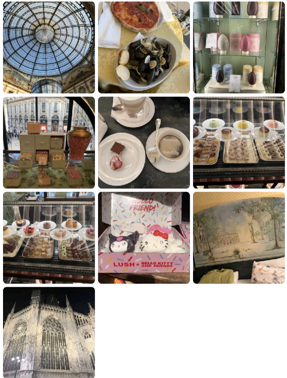 陈妍希在社交平台分享了各种美食和意大利的著名建筑的照片 这么快就到意大利了,这是为参加米兰时装周做准备的节奏,早早到了。 到达的第一天就感觉去了不少地方,开工第一天四处逛逛,挺好