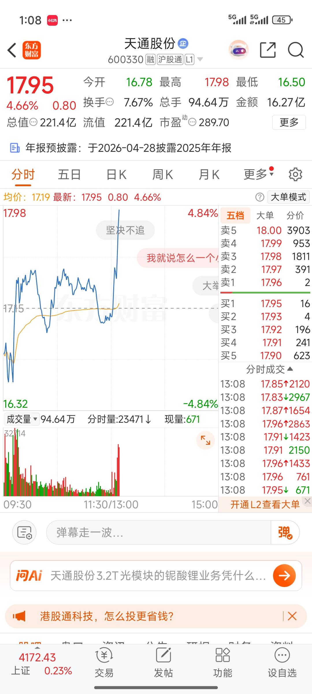 大哭啊,哭啊,真的是反向指标啊,好不容易坚持到最后一刻,天通股份上午一卖出,下午就大涨,恭喜还持有的兄弟姐妹们[赞][赞][赞]地天板股票 天普股份龙虎榜 天孚通 妖股地天板 润通股票 天宜股份