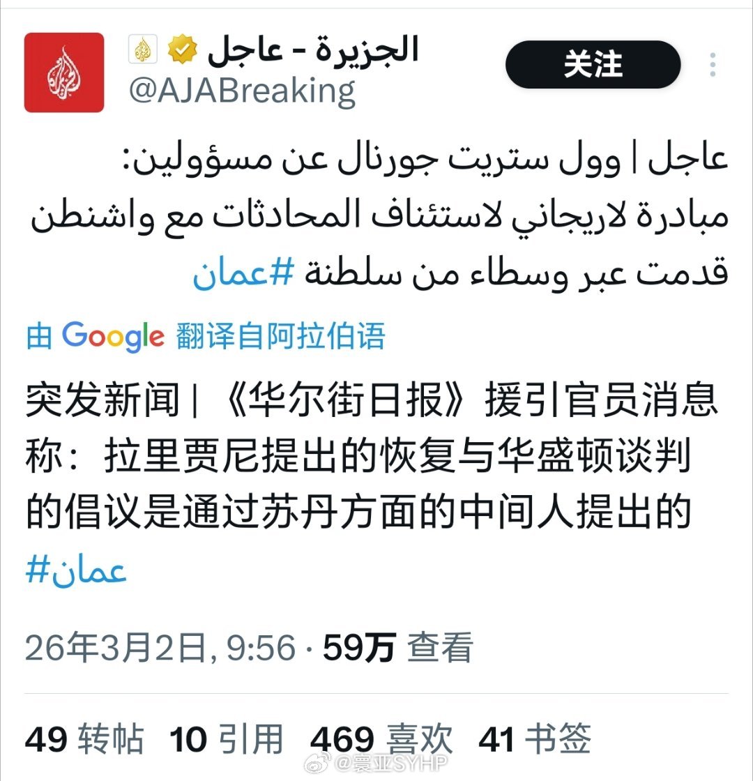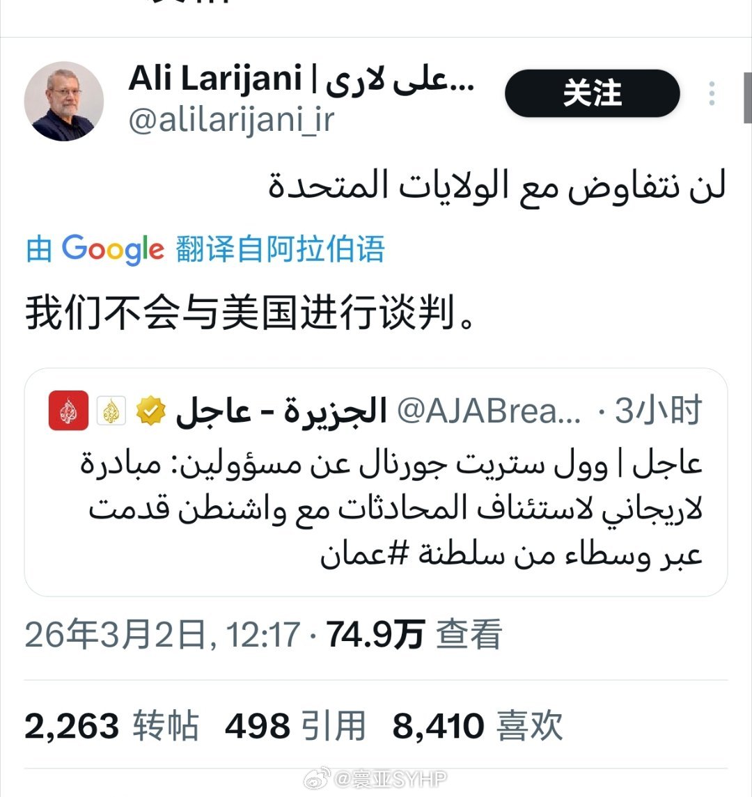 拉里贾尼转发《半岛电视台》引用《华尔街日报》的报道予以否认:我们不会与美国进行谈判。