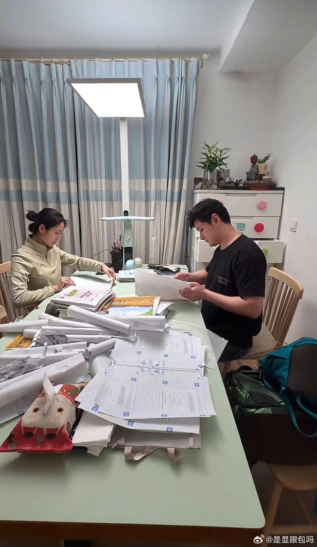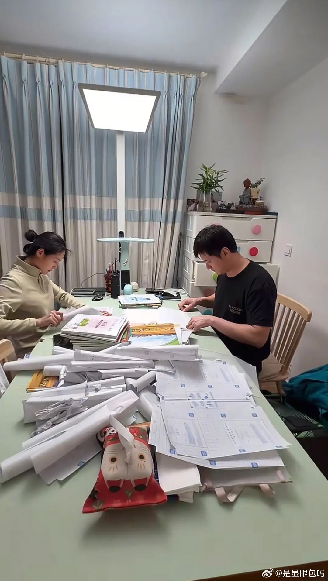 原来明星也要包书皮!王媛可王雨夫妇加班给12岁双胞胎儿子包书皮!