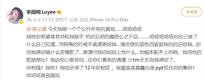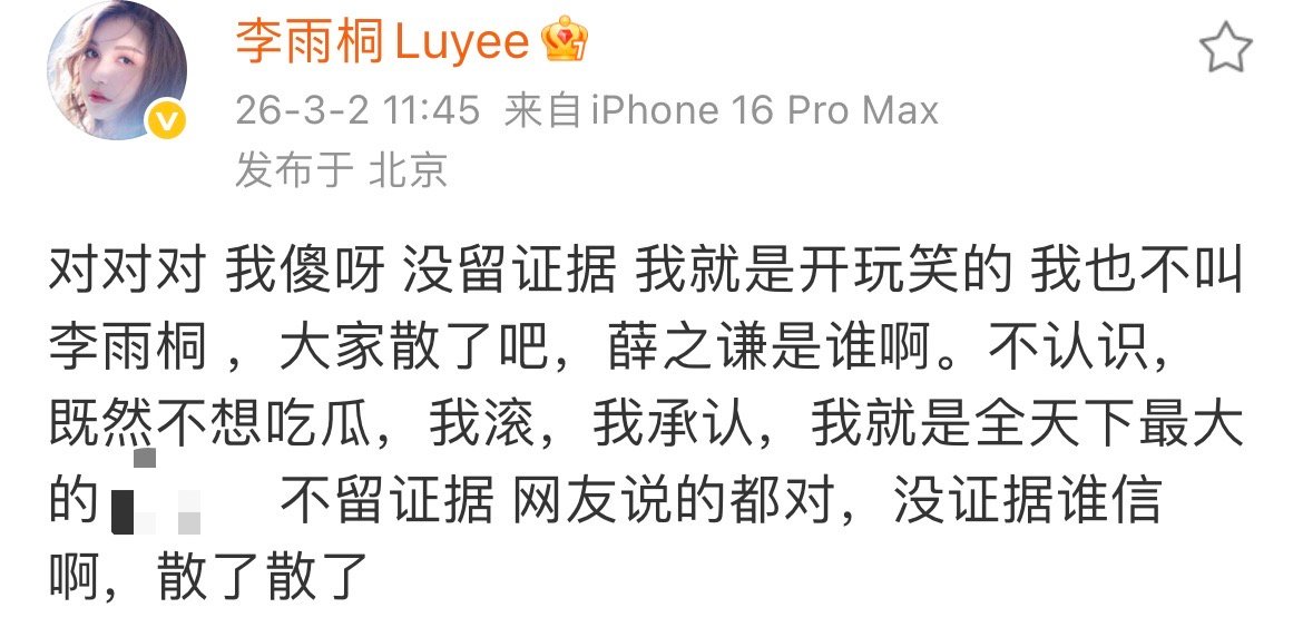 李雨桐回复:“嗯对”。李雨桐喊话薛之谦
