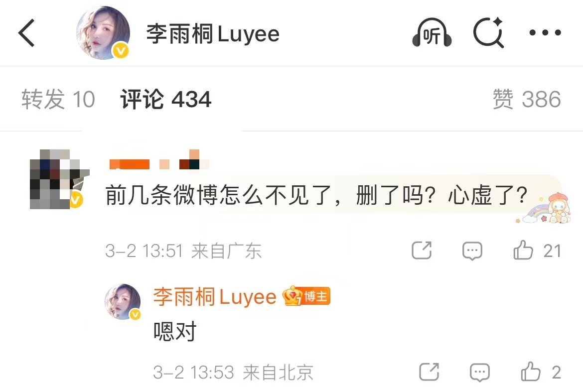 随后,有网友现身李雨桐最新微博评论区留言:“前几条微博怎么不见了?删了吗?心虚了?”