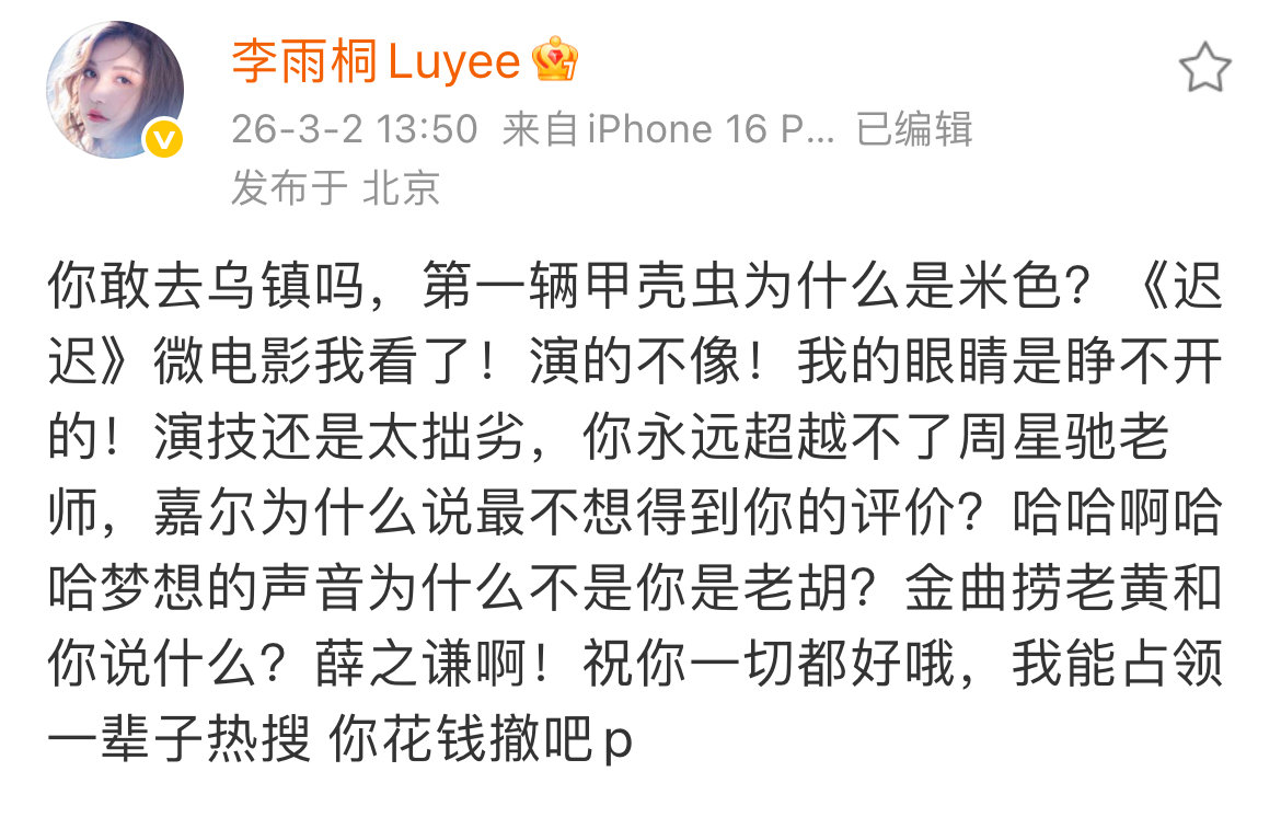 李雨桐回复删博 李雨桐删除喊话博文 3月2日,网友发现疑似删除了喊话的博文(p1-p3)。