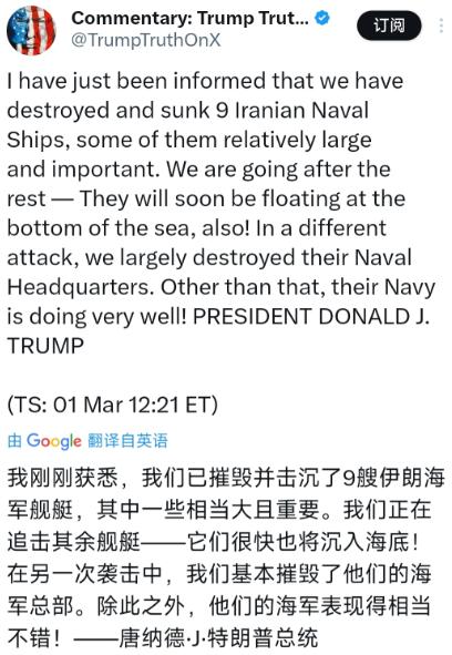 特朗普今天(北京时间3月2日)发文写道:“我刚刚获悉,我们已摧毁并击沉了9艘伊朗海军舰艇,其中一些相当大且重要。我们正在追击其余舰艇它们很快也将沉入海底!在另一次袭击中,我们基本摧毁了他们的海军总部。除此之外,他们的海军表现得相当不错!” 说白了,特朗普这一条发文,直接把中东的火药桶又往爆了推,顺带把俄对乌战争撕开的国际秩序口子,撕得更烂,弱肉强食的丛林法则,这下是真的要在全世界到处窜了! 北京时间3月2日,特朗普直接在社交平台发文,说美方已经摧毁并击沉了9艘伊朗海军舰艇,还特意提了其中一些相当大且重要,紧接着放话正在追击其余舰艇,说它们很快也会沉入海底,另外还提到,在另一次袭击中,基本摧毁了伊朗的海军总部,最后还补了一句“除此之外,他们的海军表现得相当不错”,这话听着就很耐人寻味。 我感觉,这事绝不是孤立的,早有铺垫,俄对乌战争打了四年,早就打破了八十多年来好不容易形成的国际和平秩序,原本大家还守着一些多边规则,现在彻底乱套了。 以前还讲究个外交协商、多边调停,现在倒好,谁的拳头硬、导弹射程远,谁就有话语权,真理直接就藏在导弹射程里。 就像俄乌冲突那样,多边治理机制失灵,大国博弈成了主流,中小国家的话语权越来越弱,这种弱肉强食的风气,从欧洲蔓延到中东,一点都不意外。 现在大家最关心的,就是美国接下来会怎么走,我认为美国要是不派出地面部队,想实现伊朗政权更迭,基本上是不可能的。 毕竟现在只是空袭和海上打击,顶多摧毁一些军事设施,没法彻底掌控伊朗的局势,反而会让伊朗民众的反抗情绪越来越浓,双方的仇恨只会一遍又一遍加深,根本没有缓和的余地。 但要是真的派出地面部队,麻烦可就大了,当年美国在阿富汗战争中,损失了2400多名军人,耗资超过2万亿美元,最后还是狼狈撤军,留下一摊子烂账。 要是在伊朗重蹈覆辙,甚至引发更大规模的战争,美国大概率扛不住,毕竟伊朗的军事底子不弱,而且本土作战的优势,会让美军面临巨大的伤亡。 其实不管局势怎么闹,有一点是肯定的,正义必将战胜邪恶,先进必将战胜落后,这是历史反复证明过的。 不管美国多强势,不管伊朗多憋屈,不管双方打得多激烈,这个规律从来没变过,说白了就是气死人不偿命,谁违背了这个规律,最后都得栽跟头。 就像之前美国发动的伊拉克战争、阿富汗战争,到最后都没能达到预期目的,反而让自己陷入战争泥潭,还遭到国际社会的质疑。 另外我了解到,这次美以联合对伊朗的打击,和以往不一样,是白天发动袭击,还直指伊朗的权力中枢,这种“斩首式”打击,明显是想彻底瘫痪伊朗的安全体系,而不是简单的惩戒。 但这种打法风险极高,一旦拖长战线,美国国内的争议只会越来越大,毕竟现在美国国内已经有反战集会,两党对这场战争的分歧也很大。 以上全是我个人看法,不代表任何立场,也没有评价这件事本身,只是单纯解读一下背后的关联和可能的走向。 大家觉得美国接下来会派出地面部队吗?伊朗又会怎么反击?欢迎在评论区留下你的看法。