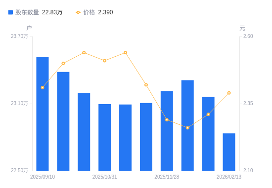 日期A股户数(户)流通A股户均持股数(股)户均持股市值(万元)2026-02-1322834045263.2610.822025-12-3123160144625.9410.312025-12-1023309444340.1010.022025-11-2823211244527.7010.202025-11-2023105944730.6210.822025-11-1023092344756.9611.372025-10-3123095344751.1511.232025-09-3023196144556.6811.322025-09-1923383344199.9711.052025-09-1023515643951.3010.59